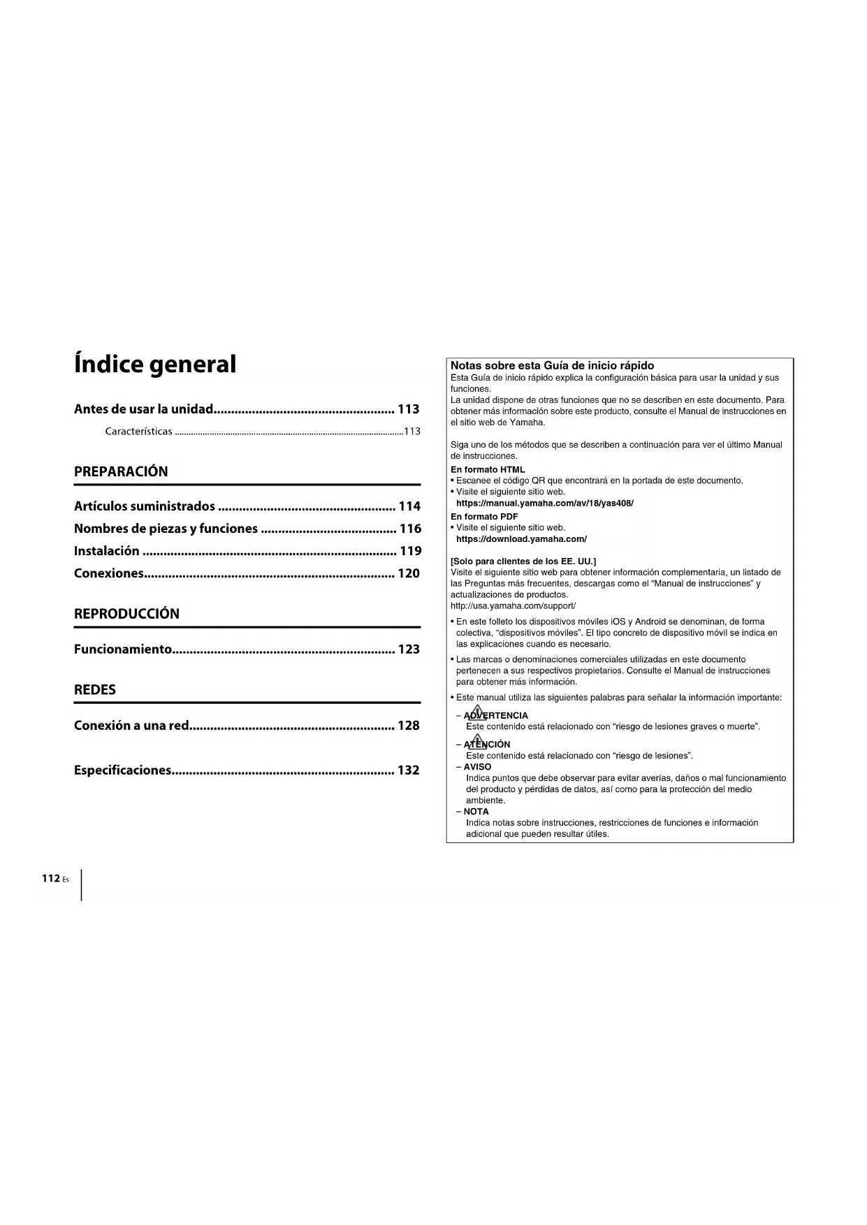 - El contenido de este manual es aplicable a las especificaciones más recientes en la fecha de publicación. Para obtener el último manual, acceda al sitio web de Yamaha y descargue el archivo del manual.Máxima potencia de salida (PIRE)Modelos del Reino Unido y EuropaBanda de 2,4 GHz19,2 dBm (83,2 mW)Banda de 5 GHzDe 5170 MHz a 5250 MHz (20 MHz): 21,5 dBm (141,3 mW)De 5250 MHz a 5330 MHz (20 MHz): 21,8 dBm (151,4 mW)De 5490 MHz a 5710 MHz (20 MHz): 24,1 dBm (257,0 mW)De 5735 MHz a 5835 MHz (20 MHz): 13,5 dBm (22,4 mW)GeneralidadesAlimentación eléctricaModelos de EE. UU. y Canadá CA 120 V, 60 HzModelo para Australia CA 240 V, 50 HzModelos de Europa, Asia y RusiaCA 110 - 240 V, 50/60 HzModelo para Reino Unido CA 230 V, 50 HzModelo de Taiwán CA 110 V, 60 HzModelo para China CA 220 V, 50 HzModelo para Corea CA 220 V, 60 HzConsumo de energía 30 W Consumo en esperaModelos para EE. UU., Canadá y TaiwánControl HDMI Desactivar, Red en standby Desactivar0,4 WControl HDMI Desactivar, Red en standby Activar (Cableado/Wi-Fi/Bluetooth)1,6/1,8/1,7 WControl HDMI Activar, Red en standby Desactivar0,7 WControl HDMI Activar, Red en standby Activar2,2 WModelos para Reino Unido y Europa, y otros modelosControl HDMI Desactivar, Red en standby Desactivar0,4 WControl HDMI Desactivar, Red en standby Activar (Cableado/Wi-Fi/Bluetooth)1,6/1,8/1,7 WControl HDMI Activar, Red en standby Desactivar0,7 WControl HDMI Activar, Red en standby Activar2,2 WDimensiones (an. x al. x prof.)980 × 60 × 110,5 mmPeso 2,7 kgWi-FiSección del amplificadorMáxima potencia de salida nominal100 WSección del altavozTipo Tipo de reflejo de graves (tipo de blindaje no magnético)Controlador Un cono de 16 cmRespuesta de frecuencia de 40 Hz a 160 HzImpedancia 2 ΩBanda de radiofrecuencia 2,4 GHzRadiofrecuencia Modelos del Reino Unido y Europade 2405,35 MHz a 2477,35 MHzMáxima potencia de salida (PIRE)Modelos del Reino Unido y Europa9,0 dBm (8 mW)Alcance de transmisión 10 m (sin interferencia)GeneralidadesAlimentación eléctrica Modelos de EE. UU. y Canadá CA 120 V, 60 HzModelos de Europa, Asia y RusiaCA 110 - 240 V, 50/60 HzModelo para Reino Unido CA 230 V, 50 HzModelo de Taiwán CA 110 V, 60 HzModelo para Corea CA 220 V, 60 HzModelo para China CA 220 V, 50 HzModelo para Australia CA 240 V, 50 HzConsumo de energía 19 WConsumo en espera Modelos para EE. UU., Canadá y Taiwán0,8 WModelos para Reino Unido y Europa, y otros modelos0,8 WDimensiones (An x Al x Prof) 180 × 417 × 405 mmPeso 9,4 kg134 Nl Inhoud Alvorens het toestel te gebruiken................................... 135 Kenmerken .........................................................................................................135 VOORBEREIDING Meegeleverde items ......................................................... 136 Namen en functies van onderdelen ................................ 138 Opstelling .......................................................................... 141 Aansluitingen.................................................................... 142 WEERGAVE Bediening .......................................................................... 145 NETWERKEN Verbinding maken met een netwerk .............................. 150 Technische gegevens ....................................................... 154 Over deze Snelstartgids Deze Snelstartgids geeft een basisinstelling om de functies van het toestel te kunnen gebruiken. Het toestel is uitgerust met een aantal andere functies die niet in dit document worden beschreven. Raadpleeg de Gebruikershandleiding op de Yamaha-website voor verdere informatie over het product. Volg een van de hieronder beschreven methoden om de laatste Gebruikershandleiding te zien. In HTML-formaat