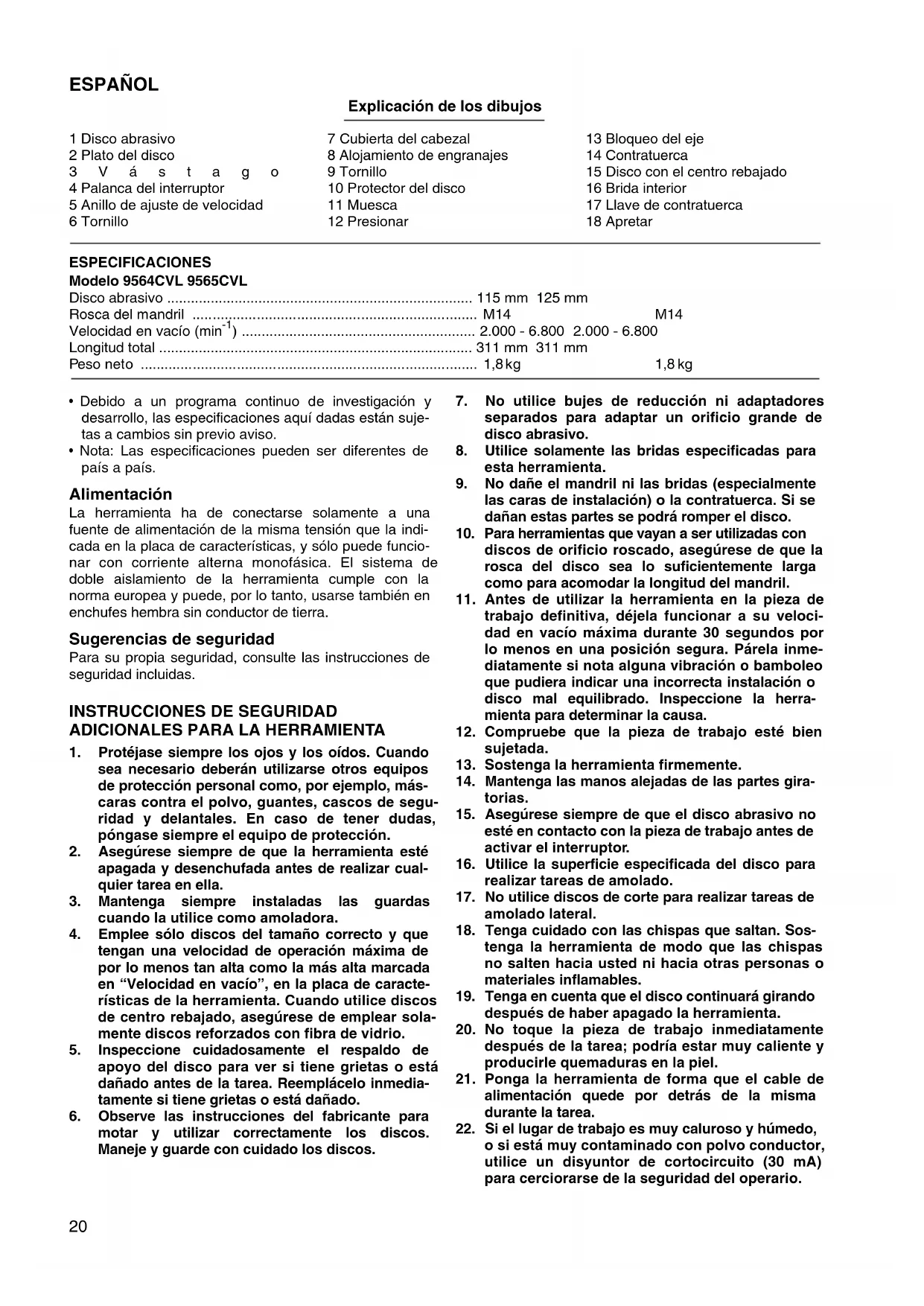 - Si apura mucho el disco, éste podrá desintegrarse y ocasionar graves heridas personales. MANTENIMIENTO PRECAUCIÓN: Asegúrese siempre de que la herramienta esté desco- nectada y desenchufada antes de realizar ninguna repa- ración en ella. Reparaciones y mantenimiento La herramienta y sus aberturas de ventilación deben mantenerse siempre limpias. Cuando entren materias extrañas (tales como polvo) por estas partes, deberán ser retiradas. Limpie regularmente dependiendo de la cantidad de polvo que se haga y entre en la herramienta. Cuando instale la cubierta del cabezal en la herramienta, desmóntela consultando “Desmontaje de la cubierta del cabezal”. Para mantener la seguridad y fiabilidad del producto, las reparaciones, el mantenimiento y los ajustes deberán ser realizados por un Centro de Servicio Autorizado de Makita.23 PORTUGUÊS Explicação geral 1 Disco abrasivo 2 Almofada 3Veio 4 Alavanca do interruptor 5 Marcador de regulação da velocidade 6 Parafuso 7 Cobertura do topo 8 Caixa do motor 9 Parafuso 10 Protector do disco 11 Rasgo 12 Pressione 13 Travão do eixo 14 Porca de bloqueio 15 Disco deprimido ao centro 16 Falange interior 17 Chave da porca de bloqueio 18 Apertar ESPECIFICAÇÕES Modelo 9564CVL 9565CVL Disco abrasivo ............................................................................. 115 mm 125 mm Rosca do eixo .............................................................................. M14 M14 Velocidade em vazio (min