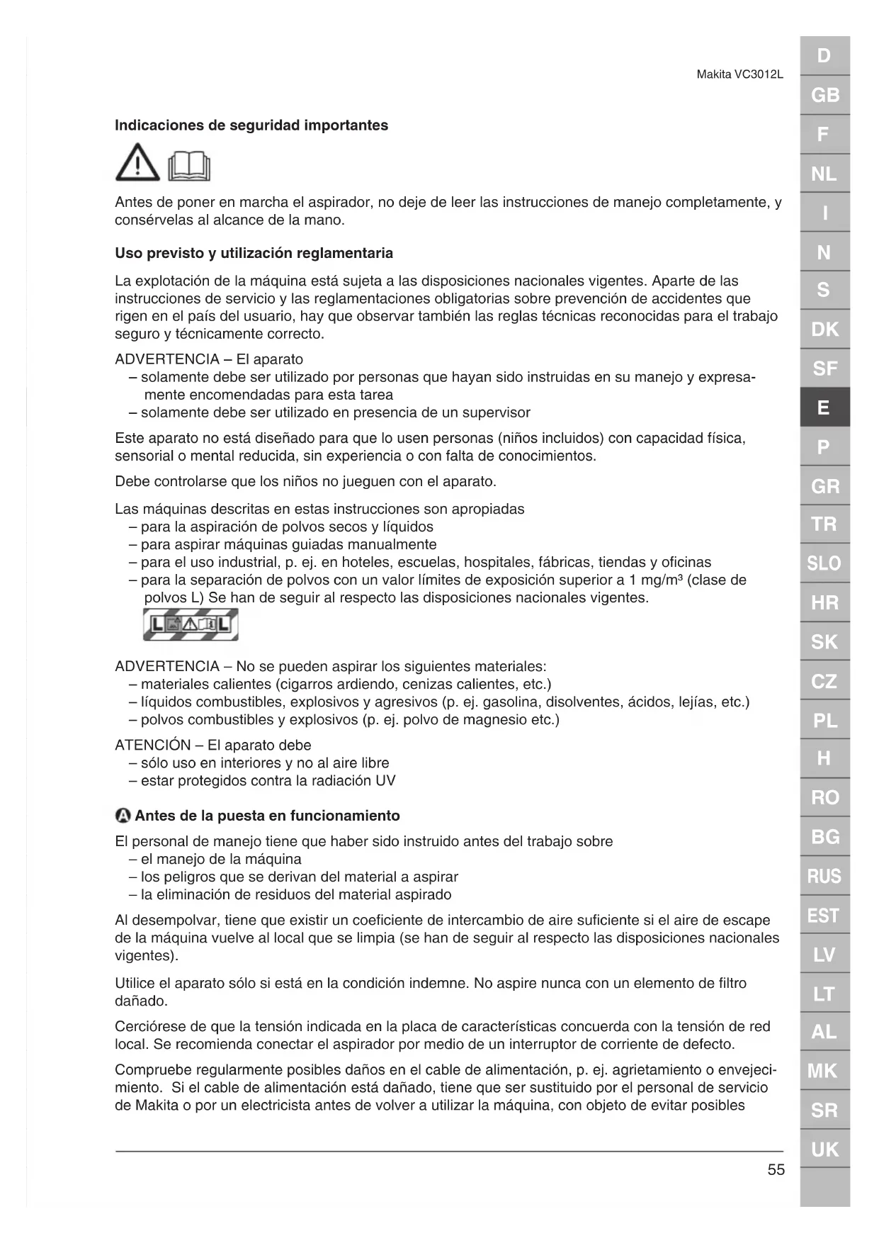 Makita VC3012L Indicaciones de seguridad importantes Antes de poner en marcha el aspirador, no deje de leer las instrucciones de manejo completamente, y consérvelas al alcance de la mano. Uso previsto y utilización reglamentaria La explotación de la máquina está sujeta a las disposiciones nacionales vigentes. Aparte de las instrucciones de servicio y las reglamentaciones obligatorias sobre prevención de accidentes que rigen en el país del usuario, hay que observar también las reglas técnicas reconocidas para el trabajo seguro y técnicamente correcto. ADVERTENCIA – El aparato – solamente debe ser utilizado por personas que hayan sido instruidas en su manejo y expresa- mente encomendadas para esta tarea – solamente debe ser utilizado en presencia de un supervisor Este aparato no está diseñado para que lo usen personas (niños incluidos) con capacidad física, sensorial o mental reducida, sin experiencia o con falta de conocimientos. Debe controlarse que los niños no jueguen con el aparato. Las máquinas descritas en estas instrucciones son apropiadas – para la aspiración de polvos secos y líquidos – para aspirar máquinas guiadas manualmente – para el uso industrial, p. ej. en hoteles, escuelas, hospitales, fábricas, tiendas y oficinas – para la separación de polvos con un valor límites de exposición superior a 1 mg/m³ (clase de polvos L) Se han de seguir al respecto las disposiciones nacionales vigentes. ADVERTENCIA – No se pueden aspirar los siguientes materiales: – materiales calientes (cigarros ardiendo, cenizas calientes, etc.) – líquidos combustibles, explosivos y agresivos (p. ej. gasolina, disolventes, ácidos, lejías, etc.) – polvos combustibles y explosivos (p. ej. polvo de magnesio etc.) ATENCIÓN – El aparato debe – sólo uso en interiores y no al aire libre – estar protegidos contra la radiación UV Antes de la puesta en funcionamiento El personal de manejo tiene que haber sido instruido antes del trabajo sobre – el manejo de la máquina – los peligros que se derivan del material a aspirar – la eliminación de residuos del material aspirado Al desempolvar, tiene que existir un coeficiente de intercambio de aire suficiente si el aire de escape de la máquina vuelve al local que se limpia (se han de seguir al respecto las disposiciones nacionales vigentes). Utilice el aparato sólo si está en la condición indemne. No aspire nunca con un elemento de filtro dañado. Cerciórese de que la tensión indicada en la placa de características concuerda con la tensión de red local. Se recomienda conectar el aspirador por medio de un interruptor de corriente de defecto. Compruebe regularmente posibles daños en el cable de alimentación, p. ej. agrietamiento o envejeci- miento. Si el cable de alimentación está dañado, tiene que ser sustituido por el personal de servicio de Makita o por un electricista antes de volver a utilizar la máquina, con objeto de evitar posiblesD