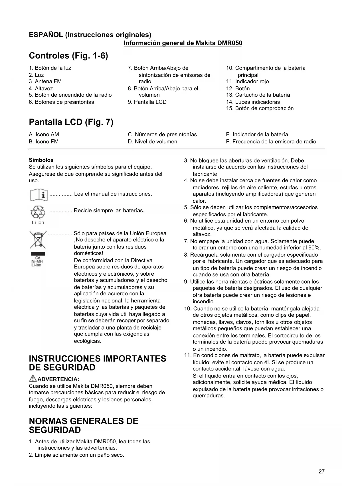 uur Ong. 12 uur Afmetingen (met accu BL1430) 263 mm x 75 mm x 196 mm Nettogewicht 0,95 kg (met accu BL1415/ BL1415N) 1,14 kg (met accu BL1430/ BL1430B/ BL1440/ BL1450/ BL1460B) 0,99 kg (met accu BL1815/ BL1815N/ BL1820/ BL1820B) 1,23 kg (met accu BL1830/BL1830B/BL1840/BL1840B/ BL1850/BL1850B) 1,29 kg (met accu BL1860B)27 ESPAÑOL (Instrucciones originales) Información general de Makita DMR050 Controles (Fig. 1-6) Pantalla LCD (Fig. 7) Símbolos Se utilizan los siguientes símbolos para el equipo. Asegúrese de que comprende su significado antes del uso. ............... Lea el manual de instrucciones. ............... Recicle siempre las baterías. ................ Sólo para países de la Unión Europea ¡No deseche el aparato eléctrico o la batería junto con los residuos domésticos! De conformidad con la Directiva Europea sobre residuos de aparatos eléctricos y electrónicos, y sobre baterías y acumuladores y el desecho de baterías y acumuladores y su aplicación de acuerdo con la legislación nacional, la herramienta eléctrica y las baterías y paquetes de baterías cuya vida útil haya llegado a su fin se deberán recoger por separado y trasladar a una planta de reciclaje que cumpla con las exigencias ecológicas. INSTRUCCIONES IMPORTANTES DE SEGURIDAD ADVERTENCIA: Cuando se utilice Makita DMR050, siempre deben tomarse precauciones básicas para reducir el riesgo de fuego, descargas eléctricas y lesiones personales, incluyendo las siguientes: