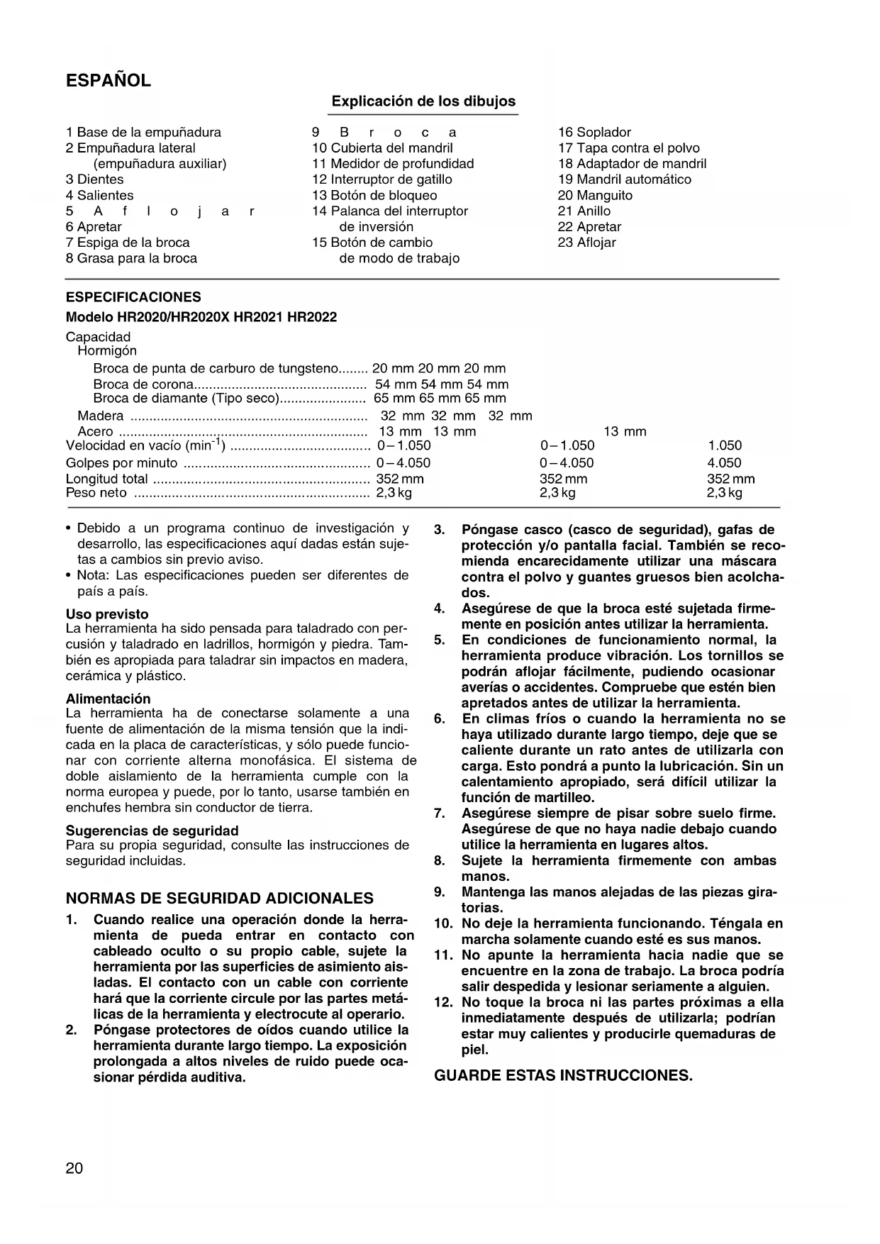 - Con esta herramienta no se pueden utilizar sierras de orificios. Éstas tienden a engancharse con facilidad en el orificio. Esto será la causa de que se active el limita- dor de torsión con demasiada frecuencia.22 Operación de perforación con martilleo Coloque la broca en el lugar en el que desea hacer el ori- ficio, y luego presione el gatillo de gatillo. No fuerce la herramienta. Una presión ligera le ofrecerá los mejores resultados. Mantenga la herramienta en posición y evite que se salga del orificio. No aplique más presión cuando el orificio quede obs- truido con virutas o partículas. En lugar de eso, haga fun- cionar la herramienta al ralentí y saque parcialmente la broca del orificio. Repitiendo esta operación varias veces, el orificio podrá ser limpiado, y se podrá reanudar la perforación normal. PRECAUCIÓN: La herramienta y la broca quedan sometidas a una tre- menda y repentina fuerza de torsión en el momento de perforarse un orificio, cuando un orificio queda obstruido con virutas y otras partículas, o cuando se golpean barras de refuerzo incrustadas en el hormigón. Durante las operaciones, utilice siempre la empuñadura lateral (asidero auxiliar) y sujete firmemente la herramienta por esta empuñadura y el anillo de cambio. De lo contrario, se podría perder el control de la herramienta y causar heridas graves. Grasa para brocas Cubra de antemano la cabeza de la espiga de la broca con una pequeña cantidad (aproximadamente 0,5 – 1,0 g) de grasa para brocas. La lubricación del mandril asegura una acción suave y una vida de servicio más larga. Soplador (Fig. 9) Utilice el soplador para limpiar el agujero. Tapa contra el polvo (Fig. 10) Utilice la tapa contra el polvo para evitar que el polvo caiga sobre la herramienta y sobre usted mismo cuando taladre en lugares elevados. Ponga la tapa contra el polvo en la broca como se muestra en la Fig. 10. Las tapas contra el polvo pueden colocarse en las brocas de los siguientes tamaños. Perforación en madera o metal (Fig. 11 y 12) Utilice el conjunto de mandril opcional (equipo de serie para el modelo HR2020X). Cuando lo instale, consulte “Instalación o extracción de la broca” descrita en la página anterior. Sujete el anillo y gire el manguito hacia la izquierda para abrir las mordazas del mandril. Ponga la broca en el mandril introduciéndola a tope. Sujete el anillo firme- mente y gire el manguito hacia la derecha para apretar el mandril. Para extraer la broca, sujete el anillo y gire el manguito hacia la izquierda. Ponga el botón de cambio de modo de trabajo en “rotación solamente”. Podrá perforar aguje- ros de hasta 13 mm de diámetro en metal y de hasta 32 mm de diámetro en madera. PRECAUCIÓN: