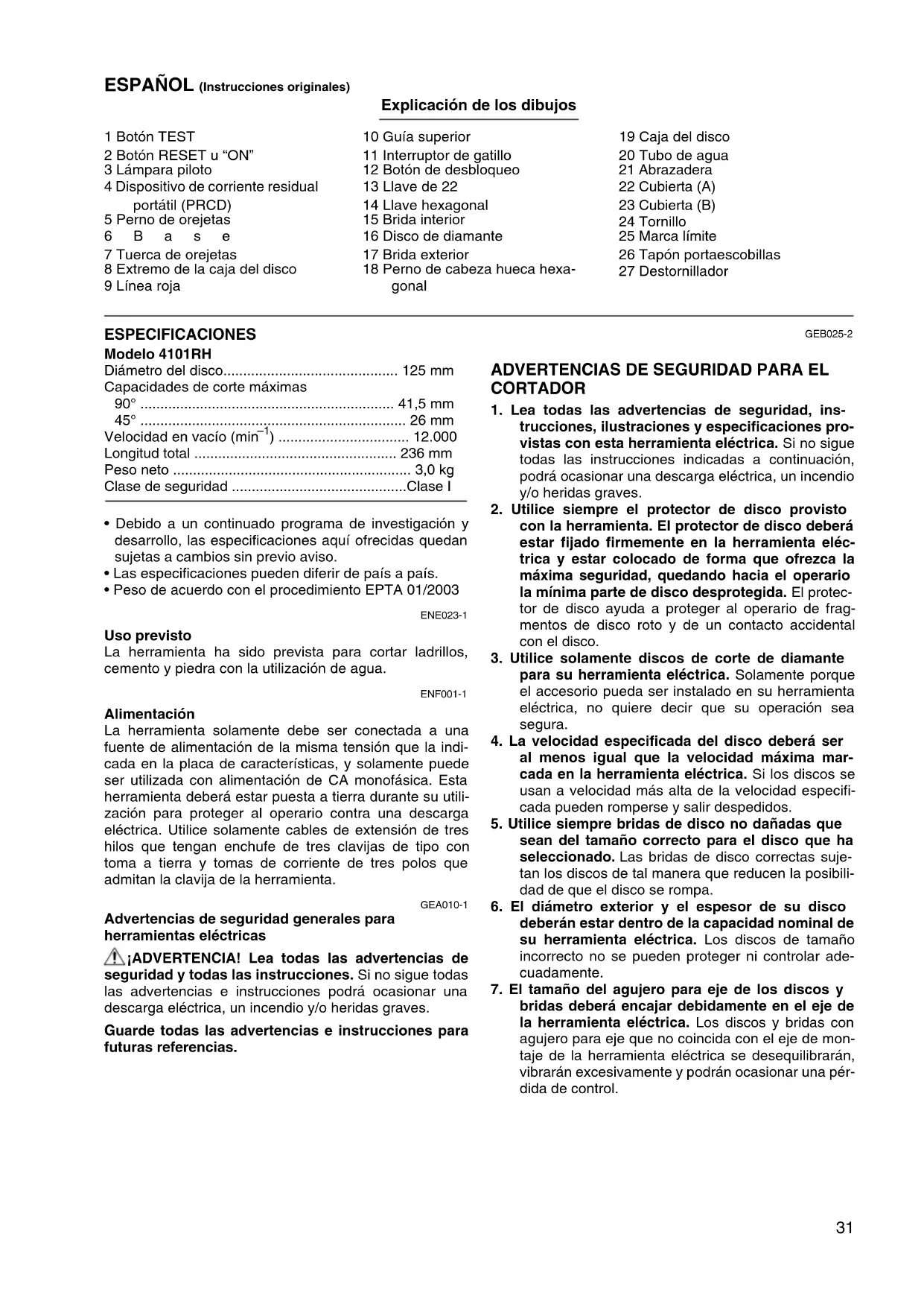 - Peso de acuerdo con el procedimiento EPTA 01/2003 ENE023-1 Uso previsto La herramienta ha sido prevista para cortar ladrillos, cemento y piedra con la utilización de agua. ENF001-1 Alimentación La herramienta solamente debe ser conectada a una fuente de alimentación de la misma tensión que la indi- cada en la placa de características, y solamente puede ser utilizada con alimentación de CA monofásica. Esta herramienta deberá estar puesta a tierra durante su utili- zación para proteger al operario contra una descarga eléctrica. Utilice solamente cables de extensión de tres hilos que tengan enchufe de tres clavijas de tipo con toma a tierra y tomas de corriente de tres polos que admitan la clavija de la herramienta. GEA010-1 Advertencias de seguridad generales para herramientas eléctricas ¡ADVERTENCIA! Lea todas las advertencias de seguridad y todas las instrucciones. Si no sigue todas las advertencias e instrucciones podrá ocasionar una descarga eléctrica, un incendio y/o heridas graves. Guarde todas las advertencias e instrucciones para futuras referencias. GEB025-2