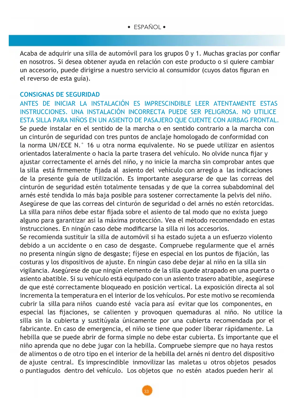 ANTES DE INICIAR LA INSTALACIÓN ES IMPRESCINDIBLE LEER ATENTAMENTE ESTAS INSTRUCCIONES. UNA INSTALACIÓN INCORRECTA PUEDE SER PELIGROSA. NO UTILICE ESTA SILLA PARA NIÑOS EN UN ASIENTO DE PASAJERO QUE CUENTE CON AIRBAG FRONTAL. Se puede instalar en el sentido de la marcha o en sentido contrario a la marcha con un cinturón de seguridad con tres puntos de anclaje homologado de conformidad con la norma UN/ECE N.° 16 u otra norma equivalente. No se puede utilizar en asientos orientados lateralmente o hacia la parte trasera del vehículo. No olvide nunca jar y ajustar correctamente el arnés del niño, y no inicie la marcha sin comprobar antes que la silla está rmemente jada al asiento del vehículo con arreglo a las indicaciones de la presente guía de utilización. Es importante asegurarse de que las correas del cinturón de seguridad estén totalmente tensadas y de que la correa subabdominal del arnés esté tendida lo más baja posible para sostener correctamente la pelvis del niño. Asegúrese de que las correas del cinturón de seguridad o del arnés no estén retorcidas. La silla para niños debe estar jada sobre el asiento de tal modo que no exista juego alguno para garantizar así la máxima protección. Vea el método recomendado en estas instrucciones. En ningún caso debe modicarse la silla ni los accesorios. Se recomienda sustituir la silla de automóvil si ha estado sujeta a un esfuerzo violento debido a un accidente o en caso de desgaste. Compruebe regularmente que el arnés no presenta ningún signo de desgaste; fíjese en especial en los puntos de jación, las costuras y los dispositivos de ajuste. En ningún caso debe dejar al niño en la silla sin vigilancia. Asegúrese de que ningún elemento de la silla quede atrapado en una puerta o asiento abatible. Si su vehículo está equipado con un asiento trasero abatible, asegúrese de que esté correctamente bloqueado en posición vertical. La exposición directa al sol incrementa la temperatura en el interior de los vehículos. Por este motivo se recomienda cubrir la silla para niños cuando esté vacía para así evitar que los componentes, en especial las jaciones, se calienten y provoquen quemaduras al niño. No utilice la silla sin la cubierta y sustitúyala únicamente por una cubierta recomendada por el fabricante. En caso de emergencia, el niño se tiene que poder liberar rápidamente. La hebilla que se puede abrir de forma simple no debe estar cubierta. Es importante que el niño aprenda que no debe jugar con la hebilla. Compruebe siempre que no haya restos de alimentos o de otro tipo en el interior de la hebilla del arnés ni dentro del dispositivo de ajuste central. Es imprescindible inmovilizar las maletas u otros objetos pesados o puntiagudos dentro del vehículo. Los objetos que no estén atados pueden herir al• ESPAÑOL •