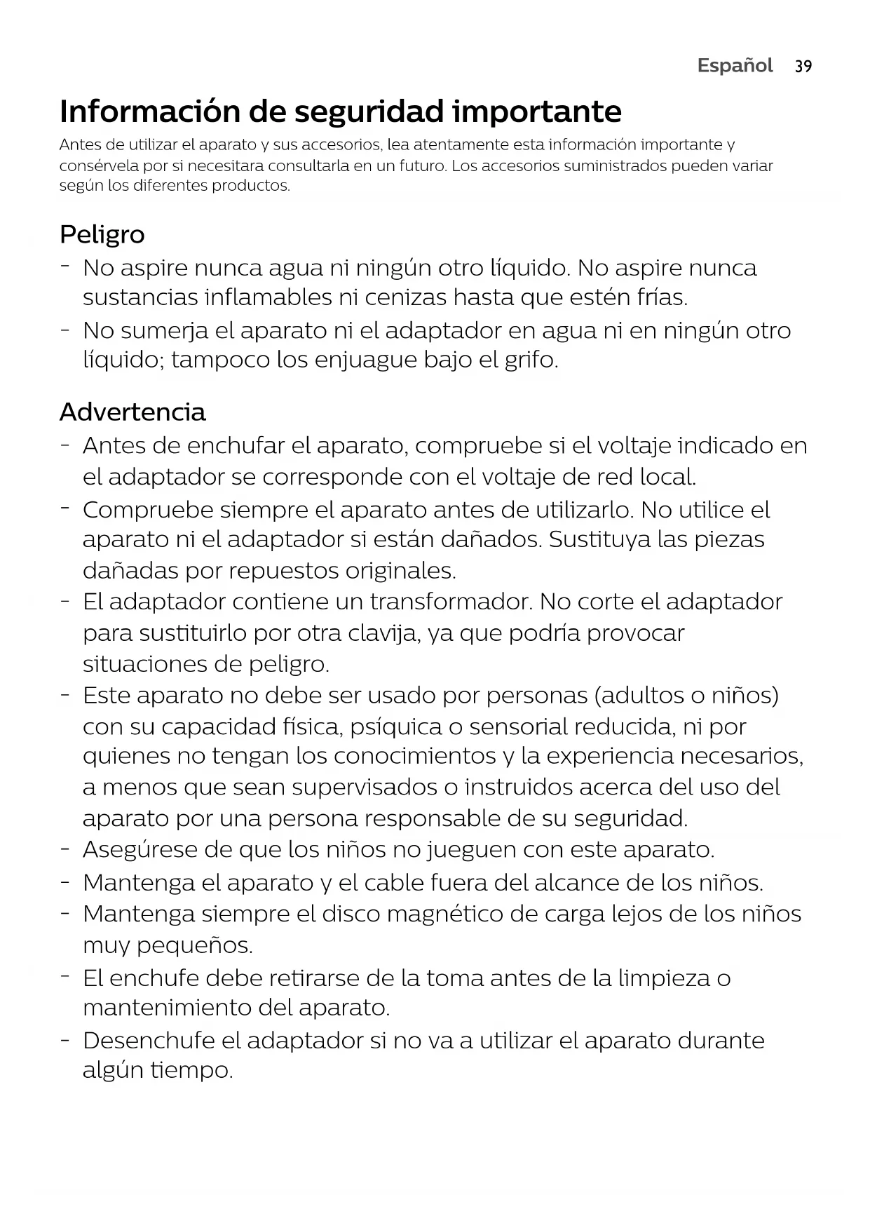 Español Información de seguridad importante Antes de utilizar el aparato y sus accesorios, lea atentamente esta información importante yconsérvela por si necesitara consultarla en un futuro. Los accesorios suministrados pueden variarsegún los diferentes productos. Peligro