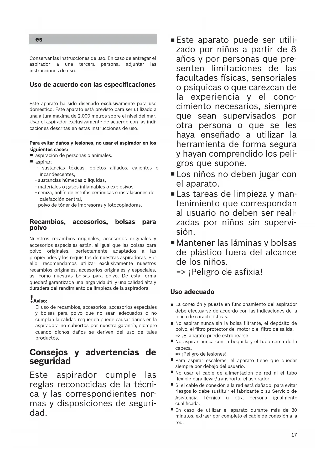 Conservar las instrucciones de uso. En caso de entregar el aspirador a una tercera persona, adjuntar las instrucciones de uso. Uso de acuerdo con las especificaciones Este aparato ha sido diseñado exclusivamente para uso doméstico. Este aparato está previsto para ser utilizado a una altura máxima de 2.000 metros sobre el nivel del mar. Usar el aspirador exclusivamente de acuerdo con las indi- caciones descritas en estas instrucciones de uso. Para evitar daños y lesiones, no usar el aspirador en los siguientes casos: aspiración de personas o animales. aspirar: - sustancias tóxicas, objetos afilados, calientes o incandescentes, - sustancias húmedas o líquidas, - materiales o gases inflamables o explosivos, - ceniza, hollín de estufas cerámicas e instalaciones de calefacción central, - polvo de tóner de impresoras y fotocopiadoras. Recambios, accesorios, bolsas para polvo Nuestros recambios originales, accesorios originales y accesorios especiales están, al igual que las bolsas para polvo originales, perfectamente adaptados a las propiedades y los requisitos de nuestras aspiradoras. Por ello, recomendamos utilizar exclusivamente nuestros recambios originales, accesorios originales y especiales, así como nuestras bolsas para polvo. De esta forma quedará garantizada una larga vida útil y una calidad alta y duradera del rendimiento de limpieza de la aspiradora. !Aviso: El uso de recambios, accesorios, accesorios especiales y bolsas para polvo que no sean adecuados o no cumplan la calidad requerida puede causar daños en la aspiradora no cubiertos por nuestra garantía, siempre cuando dichos daños se deriven del uso de tales productos. Consejos y advertencias de seguridad Este aspirador cumple las reglas reconocidas de la técni- ca y las correspondientes nor- mas y disposiciones de seguri- dad. Este aparato puede ser utili- zado por niños a partir de 8 años y por personas que pre- senten limitaciones de las facultades físicas, sensoriales o psíquicas o que carezcan de la experiencia y el cono- cimiento necesarios, siempre que sean supervisados por otra persona o que se les haya enseñado a utilizar la herramienta de forma segura y hayan comprendido los peli- gros que supone. Los niños no deben jugar con el aparato. Las tareas de limpieza y man- tenimiento que correspondan al usuario no deben ser reali- zadas por niños sin supervi- sión. Mantener las láminas y bolsas de plástico fuera del alcance de los niños. => ¡Peligro de asfixia! Uso adecuado La conexión y puesta en funcionamiento del aspirador debe efectuarse de acuerdo con las indicaciones de la placa de características. No aspirar nunca sin la bolsa filtrante, el depósito de polvo, el filtro protector del motor o el filtro de salida. => ¡El aparato puede estropearse! No aspirar nunca con la boquilla y el tubo cerca de la cabeza. => ¡Peligro de lesiones! Para aspirar escaleras, el aparato tiene que quedar siempre por debajo del usuario. No usar el cable de alimentación de red ni el tubo flexible para llevar/transportar el aspirador. Si el cable de conexión a la red está dañado, para evitar riesgos lo debe sustituir el fabricante o su Servicio de Asistencia Técnica u otra persona igualmente cualificada. En caso de utilizar el aparato durante más de 30 minutos, extraer por completo el cable de conexión a la red.Eliminación de filtros y bolsas filtrantes Los filtros y las bolsas filtrantes están fabricados con materiales respetuosos con el medio ambiente. Pueden eliminarse de forma normal, siempre y cuando no contengan ninguna sustancia que no pueda desecharse con la basura doméstica. Observaciones respecto a la etiqueta energética Esta aspiradora es una aspiradora de uso general con un tubo principal. Para obtener la eficiencia energética y la clase de limpieza declaradas al aspirar alfombras, utilizar la boquilla universal intercambiable. Para lograr la eficiencia energética y la clase de limpieza declaradas en suelos duros con juntas y ranuras, utilizar la boquilla para suelos duros sin la corona de cerdas conectable. Los cálculos se basan en el Reglamento Delegado (UE) N.º 665/2013 de la Comisión de 3 de mayo de 2013 que complementa la Directiva 2010/30/UE. Todos los procedimientos que no figuran detallados en esta declaración se realizaron sobre la base de la norma EN 60312-1:2017*. *Debido a que el examen de vida útil del motor se realizó con el colector de polvo vacío, la vida útil del motor especificada se debe aumentar un 10 % en los exámenes a colectores de polvo medio llenos.