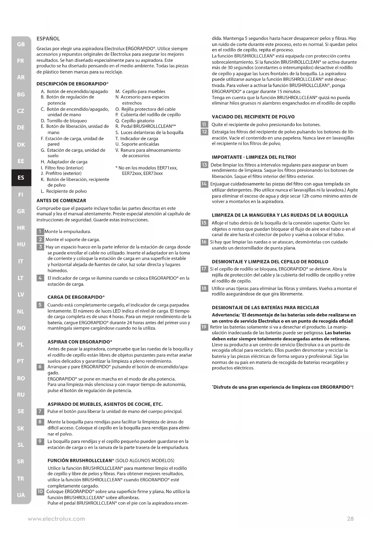 UAESPAŃOL Gracias por elegir una aspiradora Electrolux ERGORAPIDO®. Utilice siempre accesorios y repuestos originales de Electrolux para asegurar los mejores resultados. Se han diseńado especialmente para su aspiradora. Este producto se ha diseńado pensando en el medio ambiente. Todas las piezas de plástico tienen marcas para su reciclaje.