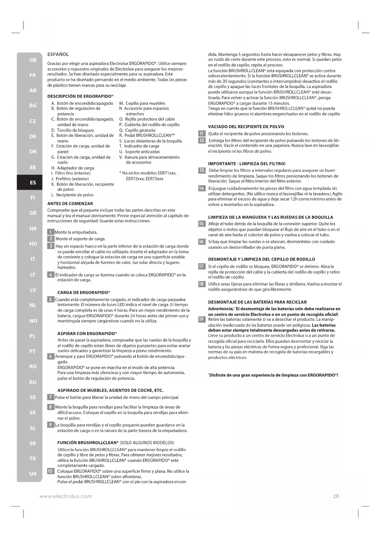 IMPORTANTE - LIMPIEZA DEL FILTRO! 13 Debe limpiar los ltros a intervalos regulares para asegurar un buen rendimiento de limpieza. Saque los ltros presionando los botones de liberación. Saque el ltro interior del ltro exterior. 14 Enjuague cuidadosamente las piezas del ltro con agua templada sin utilizar detergentes. (No utilice nunca el lavavajillas ni la lavadora.) Agite para eliminar el exceso de agua y deje secar 12h como mínimo antes de volver a montarlos en la aspiradora. LIMPIEZA DE LA MANGUERA Y LAS RUEDAS DE LA BOQUILLA 15 Aoje el tubo detrás de la boquilla de la conexión superior. Quite los objetos o restos que puedan bloquear el ujo de aire en el tubo o en el canal de aire hasta el colector de polvo y vuelva a colocar el tubo. 16 Si hay que limpiar las ruedas o se atascan, desmóntelas con cuidado usando un destornillador de punta plana. DESMONTAJE Y LIMPIEZA DEL CEPILLO DE RODILLO 17 Si el cepillo de rodillo se bloquea, ERGORAPIDO® se detiene. Abra la rejilla de protección del cable y la cubierta del rodillo de cepillo y retire el rodillo de cepillo. 18 Utilice unas tijeras para eliminar las bras y similares. Vuelva a montar el rodillo asegurándose de que gira libremente. DESMONTAJE DE LAS BATERÍAS PARA RECICLAR Advertencia; ˇEl desmontaje de las baterías solo debe realizarse en un centro de servicio Electrolux o en un punto de recogida ocial! 19 Retire las baterías solamente si va a desechar el producto. La manip- ulación inadecuada de las baterías puede ser peligrosa. Las baterías deben estar siempre totalmente descargadas antes de retirarse. Lleve su producto a un centro de servicio Electrolux o a un punto de recogida ocial para reciclarlo. Ellos pueden desmontar y reciclar la batería y las piezas eléctricas de forma segura y profesional. Siga las normas de su país en materia de recogida de baterías recargables y productos eléctricos. ˇDisfrute de una gran experiencia de limpieza con ERGORAPIDO®! 28www.electrolux.com
