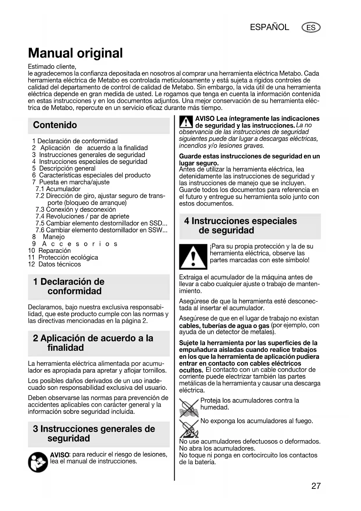 8 Manejo 9 Accesorios 10 Reparación 11 Protección ecológica 12 Datos técnicos Declaramos, bajo nuestra exclusiva responsabi- lidad, que este producto cumple con las normas y las directivas mencionadas en la página 2. La herramienta eléctrica alimentada por acumu- lador es apropiada para apretar y aflojar tornillos. Los posibles daños derivados de un uso inade- cuado son responsabilidad exclusiva del usuario. Deben observarse las normas para prevención de accidentes aplicables con carácter general y la información sobre seguridad incluida. AVISO : para reducir el riesgo de lesiones, lea el manual de instrucciones. AVISO Lea íntegramente las indicaciones de seguridad y las instrucciones. La no observancia de las instrucciones de seguridad siguientes puede dar lugar a descargas eléctricas, incendios y/o lesiones graves. Guarde estas instrucciones de seguridad en un lugar seguro. Antes de utilizar la herramienta eléctrica, lea detenidamente las instrucciones de seguridad y las instrucciones de manejo que se incluyen. Guarde todos los documentos para referencia en el futuro y entregue su herramienta solo junto con estos documentos. ¡Para su propia protección y la de su herramienta eléctrica, observe las partes marcadas con este símbolo! Extraiga el acumulador de la máquina antes de llevar a cabo cualquier ajuste o trabajo de manten- imiento. Asegúrese de que la herramienta esté desconec- tada al insertar el acumulador. Asegúrese de que en el lugar de trabajo no existan cables, tuberías de agua o gas (por ejemplo, con ayuda de un detector de metales). Sujete la herramienta por las superficies de la empuñadura aisladas cuando realice trabajos en los que la herramienta de aplicación pudiera entrar en contacto con cables eléctricos ocultos. El contacto con un cable conductor de corriente puede electrizar también las partes metálicas de la herramienta y causar una descarga eléctrica. Proteja los acumuladores contra la humedad. No exponga los acumuladores al fuego. No use acumuladores defectuosos o deformados. No abra los acumuladores. No toque ni ponga en cortocircuito los contactos de la batería. Manual original Estimado cliente, le agradecemos la confianza depositada en nosotros al comprar una herramienta eléctrica Metabo. Cada herramienta eléctrica de Metabo es controlada meticulosamente y está sujeta a rígidos controles de calidad del departamento de control de calidad de Metabo. Sin embargo, la vida útil de una herramienta eléctrica depende en gran medida de usted. Le rogamos que tenga en cuenta la información contenida en estas instrucciones y en los documentos adjuntos. Una mejor conservación de su herramienta eléc- trica de Metabo, repercute en un servicio eficaz durante más tiempo. Contenido 1 Declaración de conformidad 2 Aplicación de acuerdo a la finalidad 3 Instrucciones generales de seguridad 4 Instrucciones especiales de seguridad 17026933_0311 SSW SSD 14_4 18.book Seite 27 Mittwoch, 9. März 2011 1:55 1328 ESPAÑOL
