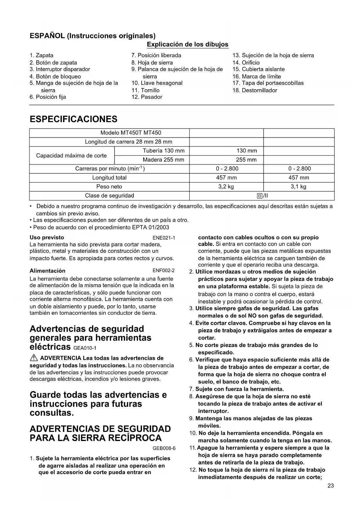Modelo MT450T MT450 Longitud de carrera 28 mm 28 mm Capacidad máxima de corte Tubería 130 mm 130 mm Madera 255 mm 255 mm Carreras por minuto (mín