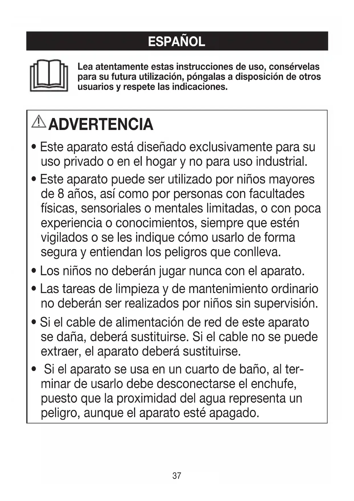 - Este aparato puede ser utilisé por niños mayores de 8 años, asi como por personas con facultades físicas, sensoriales o mentales limitadas, o con.poca experiencia o conocimientos, siempre que estén vigilados o se les indique como usar de forma segura yentaendan los peligros que conlleva.