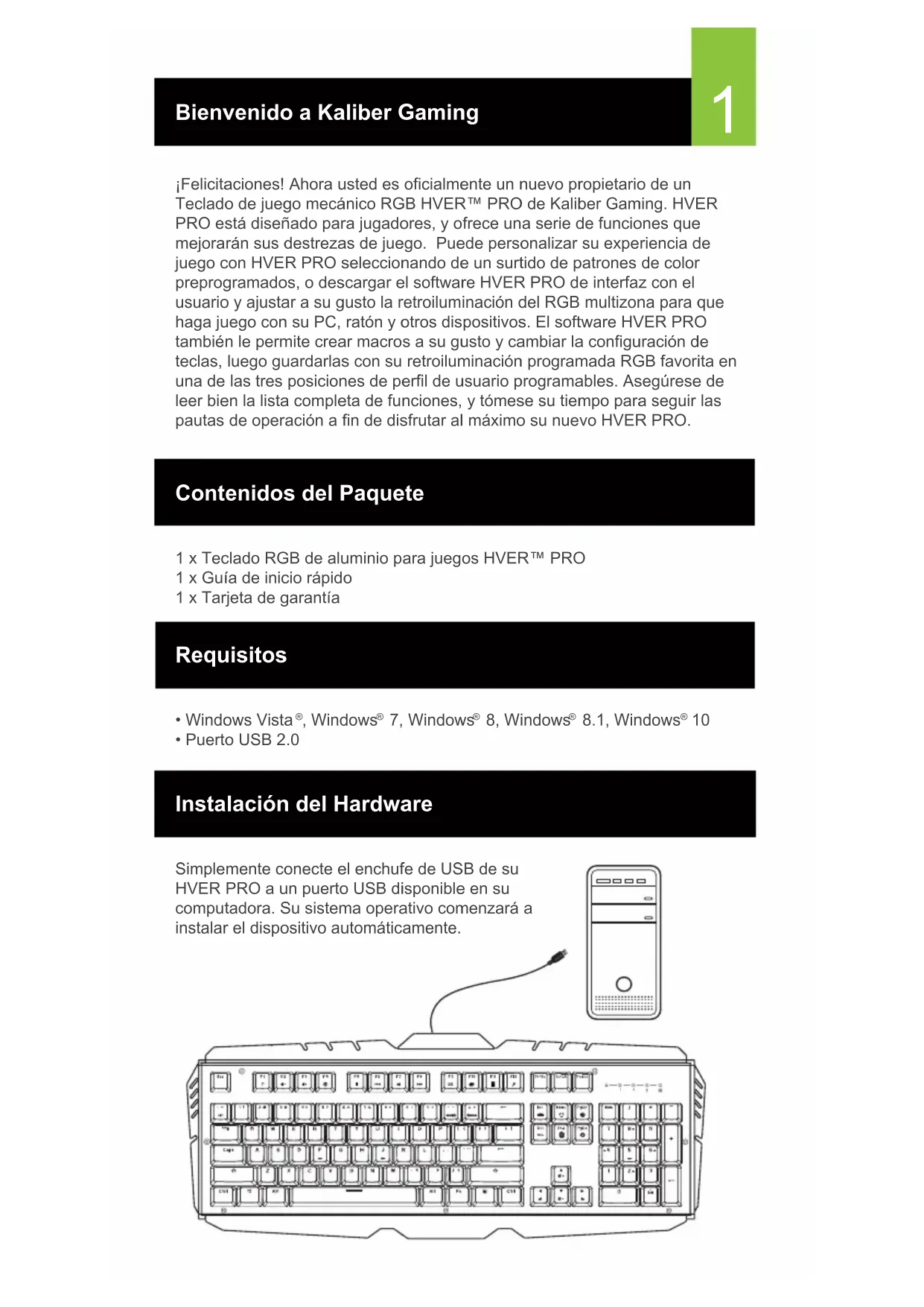 Simplemente conecte el enchufe de USB de su HVER PRO a un puerto USB disponible en su computadora. Su sistema operativo comenzará a instalar el dispositivo automáticamente. ¡Felicitaciones! Ahora usted es oficialmente un nuevo propietario de un Teclado de juego mecánico RGB HVER™ PRO de Kaliber Gaming. HVER PRO está diseñado para jugadores, y ofrece una serie de funciones que mejorarán sus destrezas de juego. Puede personalizar su experiencia de juego con HVER PRO seleccionando de un surtido de patrones de color preprogramados, o descargar el software HVER PRO de interfaz con el usuario y ajustar a su gusto la retroiluminación del RGB multizona para que haga juego con su PC, ratón y otros dispositivos. El software HVER PRO también le permite crear macros a su gusto y cambiar la configuración de teclas, luego guardarlas con su retroiluminación programada RGB favorita en una de las tres posiciones de perfil de usuario programables. Asegúrese de leer bien la lista completa de funciones, y tómese su tiempo para seguir las pautas de operación a fin de disfrutar al máximo su nuevo HVER PRO. Instalación del Hardware