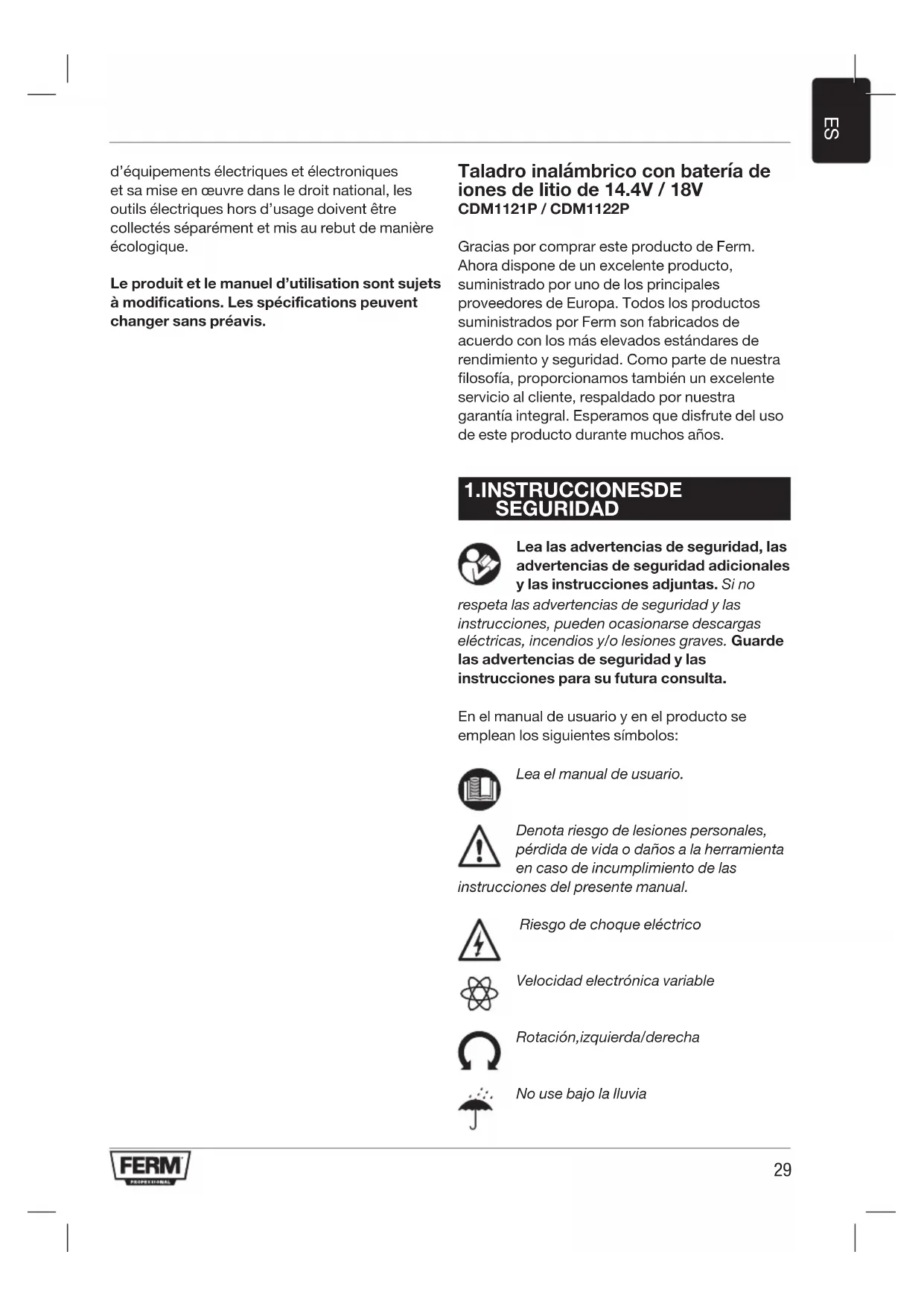 Gracias por comprar este producto de Ferm. Ahora dispone de un excelente producto, suministrado por uno de los principales proveedores de Europa. Todos los productos suministrados por Ferm son fabricados de acuerdo con los más elevados estándares de rendimiento y seguridad. Como parte de nuestra filosofía, proporcionamos también un excelente servicio al cliente, respaldado por nuestra garantía integral. Esperamos que disfrute del uso de este producto durante muchos años.