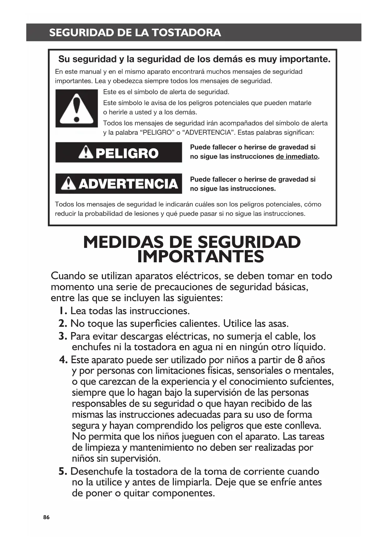 - Atenciónalcliente Índice W10506838B_06_ES.indd 85 2/12/14 5:27 PM86 SEGURIDAD DE LA TOSTADORASEGURIDAD DE LA TOSTADORA Su seguridad y la seguridad de los demás es muy importante. En este manual y en el mismo aparato encontrará muchos mensajes de seguridad importantes. Lea y obedezca siempre todos los mensajes de seguridad.Este es el símbolo de alerta de seguridad.Este símbolo le avisa de los peligros potenciales que pueden matarle o herirle a usted y a los demás.Todos los mensajes de seguridad irán acompañados del símbolo de alerta y la palabra “PELIGRO” o “ADVERTENCIA”. Estas palabras signican:Puede fallecer o herirse de gravedad si no sigue las instrucciones de inmediato.Puede fallecer o herirse de gravedad si no sigue las instrucciones.Todos los mensajes de seguridad le indicarán cuáles son los peligros potenciales, cómo reducir la probabilidad de lesiones y qué puede pasar si no sigue las instrucciones. PELIGRO ADVERTENCIA Cuando se utilizan aparatos eléctricos, se deben tomar en todo momento una serie de precauciones de seguridad básicas, entre las que se incluyen las siguientes: p. 100