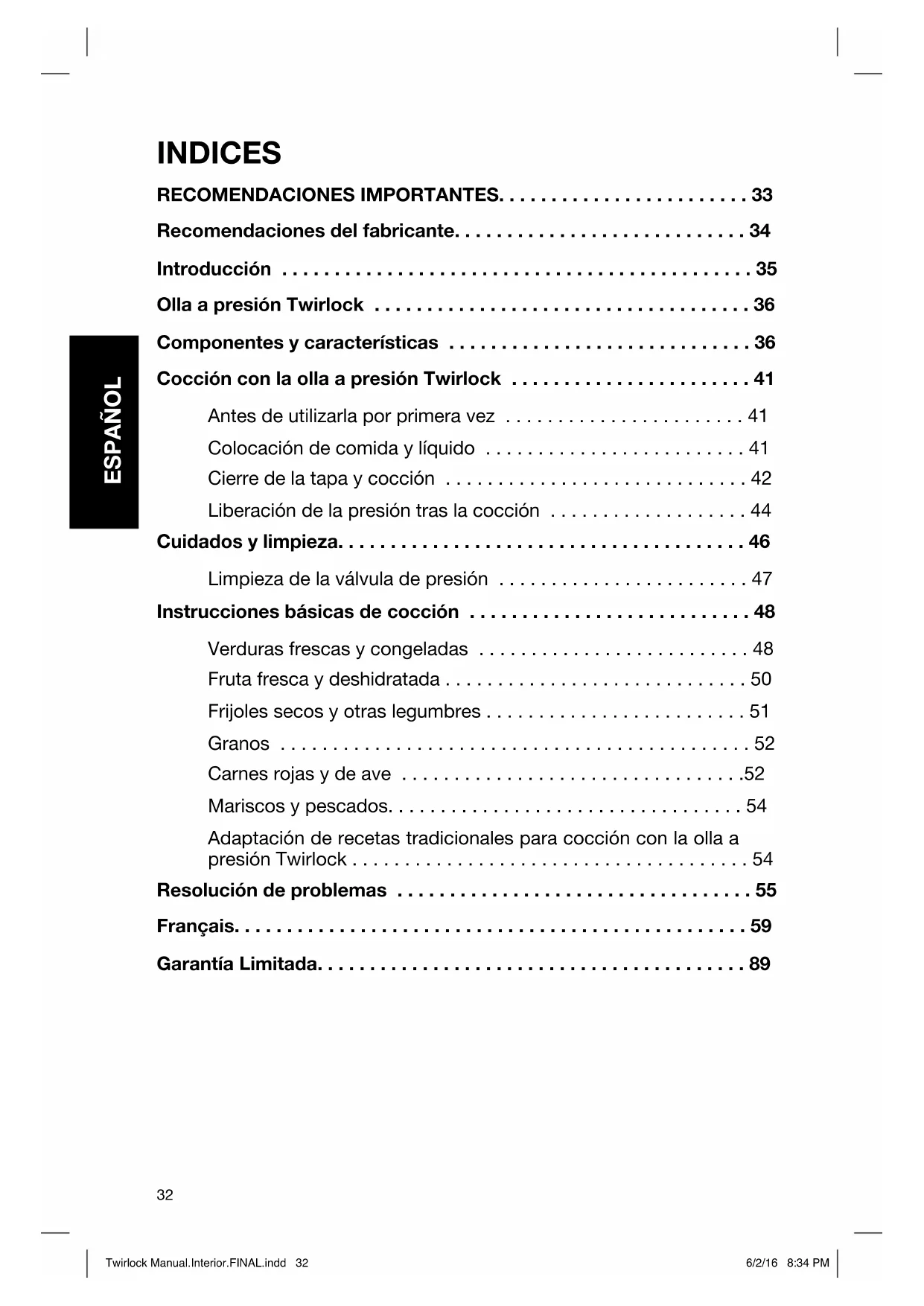 - Twirlock Manual.Interior.FINAL.indd 30Twirlock Manual.Interior.FINAL.indd 30 6/2/16 8:34 PM6/2/16 8:34 PM31 ESPAÑOL Twirlock Manual.Interior.FINAL.indd 31Twirlock Manual.Interior.FINAL.indd 31 6/2/16 8:34 PM6/2/16 8:34 PM32 ESPAÑOL INDICES RECOMENDACIONES IMPORTANTES p. 33