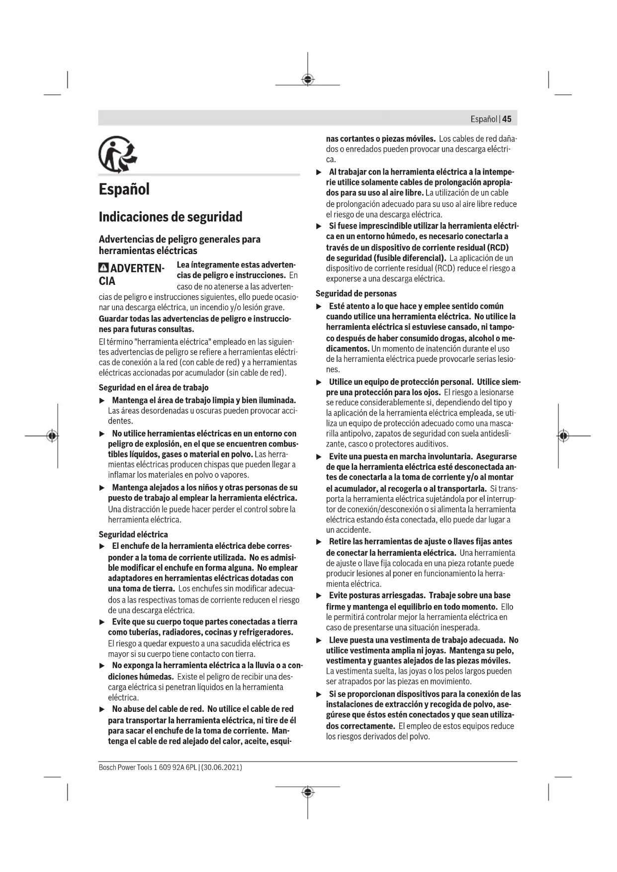] [m/s] 75 30 M 14 11500 45 82 – M 14 11500 80 Girar el cabezal del engranaje (ver figuraA) u Antes de cualquier manipulación en la herramienta eléctrica, sacar el enchufe de red de la toma de co- rriente. Puede girar la cabeza del engranaje en pasos de 90 °. De es- te modo, el interruptor de conexión/desconexión puede si- tuarse en una posición de manejo más adecuada para casos especiales, por ejemplo, para zurdos. Desenrosque totalmente los 4 tornillos. Gire la cabeza del engranaje cuidadosamente y sin quitarla de la caja a la nue- va posición. Apriete de nuevo firmemente los 4 tornillos. Aspiración de polvo y virutas El polvo de ciertos materiales como, pinturas que contengan plomo, ciertos tipos de madera y algunos minerales y meta- les, puede ser nocivo para la salud. El contacto y la inspira- ción de estos polvos pueden provocar en el usuario o en las personas circundantes reacciones alérgicas y/o enfermeda- des respiratorias. Ciertos polvos como los de roble, encina y haya son conside- rados como cancerígenos, especialmente en combinación con los aditivos para el tratamiento de la madera (cromatos, conservantes de la madera). Los materiales que contengan amianto solamente deberán ser procesados por especialis- tas. – A ser posible utilice un equipo para aspiración de polvo apropiado para el material a trabajar. – Observe que esté bien ventilado el puesto de trabajo. – Se recomienda una mascarilla protectora con un filtro de la clase P2. Observe las prescripciones vigentes en su país sobre los ma- teriales a trabajar. u Evite acumulaciones de polvo en el puesto de trabajo. Los materiales en polvo se pueden inflamar fácilmente. Operación Puesta en marcha u ¡Observe la tensión de alimentación! La tensión de ali- mentación deberá coincidir con las indicaciones en la placa de características de la herramienta eléctrica. Las herramientas eléctricas marcadas con 230V pue- den funcionar también a 220V. Bosch Power Tools 1 609 92A 6PL | (30.06.2021)56 | Español En el caso del servicio de la herramienta eléctrica con gene- radores de corriente móviles (generadores) que no tienen suficientes reservas de potencia o no tienen una regulación de tensión adecuada con amplificación de corriente de arranque, pueden producirse pérdidas de potencia o com- portamiento no típico durante la conexión. Por favor, preste atención a la idoneidad del generador de corriente utilizando, especialmente con respecto a la tensión de alimentación y la frecuencia. Conexión/desconexión Para la puesta en servicio de la herramienta eléctrica des- place el interruptor de conexión/desconexión (3) hacia de- lante. Para fijar el interruptor de conexión/desconexión (3), pre- sione el interruptor de conexión/desconexión (3) por delan- te hacia abajo, hasta que encastre. Para desconectar la herramienta eléctrica, suelte el inte- rruptor de conexión/desconexión (3) o si está bloqueado, presione brevemente el interruptor de conexión/descone- xión (3) por detrás hacia abajo y luego suéltelo. u Compruebe los útiles abrasivos antes del uso. El útil abrasivo debe estar montado correctamente y debe poder girar libremente. Realice una marcha de prueba de como mínimo 1 minuto sin carga. No utilice útiles abrasivos dañados, excéntricos o que vibran. Los úti- les abrasivos dañados pueden estallar y originar lesiones. Protección contra rearranque La protección contra rearranque evita la puesta en marcha accidental de la herramienta eléctrica tras un corte de la ali- mentación eléctrica. Para la nueva puesta en marcha, coloque el interruptor de conexión/desconexión (3) en la posición de desconexión y conecte de nuevo la herramienta eléctrica. Limitación de la corriente de arranque La limitación de la corriente de arranque reduce la potencia absorbida al conectar la herramienta eléctrica para poder trabajar en instalaciones con un fusible de 16A. Indicación: Si la herramienta eléctrica comienza a girar a plenas revoluciones inmediatamente tras la conexión, no funciona el limitador de corriente de arranque y la protec- ción de rearranque. La herramienta eléctrica deberá enviar- se de inmediato a uno de los servicios técnicos que se indi- can bajo el apartado "Servicio técnico y atención al cliente". Desconexión de retroceso (GWS 12-125 CI / GWS 13-125 CI / GWS 13-125 CIE / GWS 15-125 CIE / GWS 15-125 Inox / GWS 17-125 CI / GWS17-125 CIE / GWS 17-125 CIT / GWS 17-150 CI / GWS 17-125 Inox / GWS 19-125 CI / GWS 19-125 CIE / GWS 19-150 CI / GWS 19-125 CIST) En el caso de un repentino contragolpe de la herramienta eléctrica, p. ej. bloqueo en el cor- te de separación, se interrumpe electrónica- mente la alimentación de corriente del motor. Para la nueva puesta en marcha, coloque el interruptor de conexión/desconexión (3) en la posición de desconexión y conecte de nuevo la herramienta eléctrica. Electrónica Constante (GWS 12-125 CI / GWS 13-125 CI / GWS 13-125 CIE / GWS 15-125 CIE / GWS 15-125 Inox / GWS 17-125 CI / GWS17-125 CIE / GWS 17-125 CIT / GWS 17-150 CI / GWS 17-125 Inox / GWS 19-125 CI / GWS 19-125 CIE / GWS 19-150 CI / GWS 19-125 CIST) La electrónica constante mantiene prácticamente constan- tes las revoluciones, independientemente de la carga, y ase- gura un rendimiento de trabajo uniforme. Preselección de revoluciones (GWS 13-125 CIE / GWS 15-125 CIE / GWS 15-125 Inox / GWS 17-125 CIE / GWS 17-125 CIT / GWS 17-125 Inox / GWS 19-125 CIE) Con la rueda de ajuste de la preselección del número de re- voluciones (4) puede preseleccionar el número de revolucio- nes necesario también durante el servicio. Los valores indi- cados en la siguiente tabla son solamente valores de orienta- ción. Material Aplicación Útil Posición rueda de ajuste Metal Decapado de pintura Hoja lijadora 2 − 3 Madera, metal Cepillado, desoxidación Cepillo de vaso, hoja lijadora 3 Metal, piedra Lijado Disco abrasivo 4 − 6 Metal Desbastado Disco abra