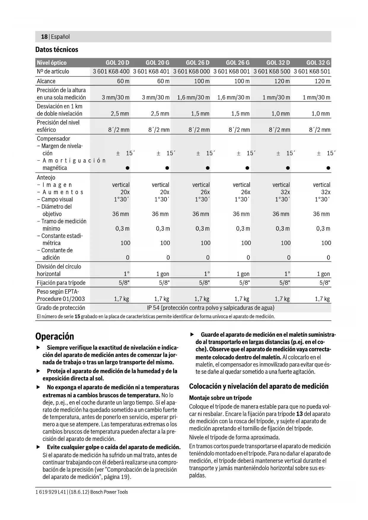 OBJ_BUCH-1239-002.book Page 16 Monday, June 18, 2012 10:51 AMEspañol | 17 Bosch Power Tools 1 619 929 L41 | (18.6.12) se trouve dans le coffret ; il sert à absorber l’humidité. Rempla- cez régulièrement le sachet de gel de silice par un neuf. Si, malgré tous les soins apportés à la fabrication et au contrô- le de l’appareil de mesure, celui-ci présentait un défaut, la ré- paration ne doit être confiée qu’à une station de Service Après-Vente agréée pour l’outillage Bosch. Ne démontez pas l’appareil de mesure vous-même. Pour toute demande de renseignement ou commande de piè- ces de rechange, précisez-nous impérativement le numéro d’article à dix chiffres de l’appareil de mesure indiqué sur la plaque signalétique. Si l’appareil doit être réparé, envoyez-le dans son coffret. Service Après-Vente et Assistance Des Clients Notre Service Après-Vente répond à vos questions concernant la réparation et l’entretien de votre produit et les pièces de re- change. Vous trouverez des vues éclatées ainsi que des infor- mations concernant les pièces de rechange également sous : www.bosch-pt.com Les conseillers techniques Bosch sont à votre disposition pour répondre à vos questions concernant l’achat, l’utilisation et le réglage de vos produits et de leurs accessoires. France Vous êtes un utilisateur, contactez : Le Service Clientèle Bosch Outillage Electroportatif Tel. : 0 811 36 01 22 (coût d’une communication locale) Fax : +33 (0) 1 49 45 47 67 E-Mail : contact.outillage-electroportatif@fr.bosch.com Vous êtes un revendeur, contactez : Robert Bosch (France) S.A.S. Service Après-Vente Electroportatif 126, rue de Stalingrad 93705 DRANCY Cédex Tel. : +33 (0) 1 43 11 90 06 Fax : +33 (0) 1 43 11 90 33 E-Mail : sav.outillage-electroportatif@fr.bosch.com Belgique, Luxembourg Tel. : +32 2 588 0589 Fax : +32 2 588 0595 E-Mail : outillage.gereedschap@be.bosch.com Suisse Tel. : +41 (044) 8 47 15 12 Fax : +41 (044) 8 47 15 52 Autres pays Pour avoir des renseignements concernant la garantie, les tra- vaux d’entretien ou de réparation ou les pièces de rechange, veuillez contacter votre détaillant spécialisé. Elimination des déchets Les appareils de mesure ainsi que leurs accessoires et embal- lages, doivent pouvoir suivre chacun une voie de recyclage appropriée. Sous réserve de modifications. Español Instrucciones de seguridad Deberán leerse y respetarse todas las ins- trucciones. GUARDE ESTAS INSTRUCCIONES EN UN LUGAR SEGURO. f Únicamente haga reparar su aparato de medición por un profesional, empleando exclusivamente piezas de repuesto originales. Solamente así se mantiene la seguri- dad del aparato de medición. Descripción y prestaciones del producto Despliegue y mantenga abierta la solapa con la imagen del apa- rato de medición mientras lee las instrucciones de manejo. Utilización reglamentaria El aparato de medición ha sido diseñado para determinar y controlar con exactitud niveles horizontales. Además, es ade- cuado también para medir alturas, distancias y ángulos. Componentes principales La numeración de los componentes está referida a la imagen del aparato de medición en la página ilustrada. 1 Objetivo 2 Visor 3 Espejo del nivel de burbuja 4 Protección del ocular 5 Tornillo de ajuste de la visual 6 Ocular 7 Nivel esférico 8 Botón de bloqueo del compensador 9 Índice de lectura del círculo horizontal 10 Círculo horizontal 11 Tornillo de ajuste del nivel esférico 12 Tornillo de nivelación 13 Fijación para trípode de 5/8" (en la parte inferior) 14 Ajuste fino lateral 15 Número de serie 16 Botón de enfoque 17 Llave macho hexagonal 18 Espiga de ajuste 19 Maletín 20 Plomada Los accesorios descritos e ilustrados no corresponden al material que se adjunta de serie. OBJ_BUCH-1239-002.book Page 17 Monday, June 18, 2012 10:51 AM18 | Español 1 619 929 L41 | (18.6.12) Bosch Power Tools Datos técnicos Operación f Siempre verifique la exactitud de nivelación e indica- ción del aparato de medición antes de comenzar la jor- nada de trabajo o tras un largo transporte del mismo. f Proteja el aparato de medición de la humedad y de la exposición directa al sol. f No exponga el aparato de medición ni a temperaturas extremas ni a cambios bruscos de temperatura. No lo deje, p.ej., en el coche durante un largo tiempo. Si el apa- rato de medición ha quedado sometido a un cambio fuerte de temperatura, antes de ponerlo en servicio, esperar pri- mero a que se atempere. Las temperaturas extremas o los cambios bruscos de temperatura pueden afectar a la pre- cisión del aparato de medición. f Evite cualquier golpe o caída del aparato de medición. Si el aparato de medición ha sufrido un mal trato, antes de continuar trabajando con él deberá realizarse una compro- bación de la precisión (ver “Comprobación de la precisión del aparato de medición”, página 19). f Guarde el aparato de medición en el maletín suministra- do al transportarlo en largas distancias (p.ej. en el co- che). Observe que el aparato de medición vaya correcta- mente colocado dentro del maletín. Al colocarlo en el maletín, el compensador es inmovilizado para evitar que és- te se dañe al quedar sometido a una fuerte agitación. Colocación y nivelación del aparato de medición Montaje sobre un trípode Coloque el trípode de manera estable para que no pueda vol- car ni resbalar. Encare la fijación para trípode 13 del aparato de medición con la rosca del trípode, y sujete el aparato de medición apretando el tornillo de fijación del trípode. Nivele el trípode de forma aproximada. En tramos cortos puede transportarse el aparato de medición teniéndolo montado en el trípode. Para no dañar el aparato de medición, el trípode deberá mantenerse vertical durante el transporte y jamás manteniéndolo horizontal sobre sus es- paldas. Nivel óptico GOL 20 D GOL 20 G GOL 26 D GOL 26 G GOL 32 D GOL 32 G Nº de artículo 3 601 K68 400 