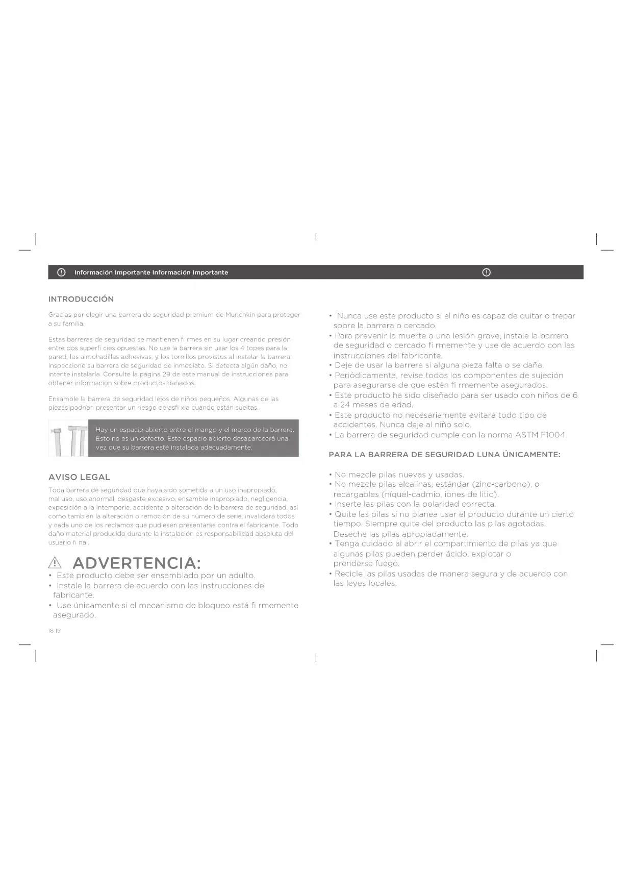 - Use únicamente si el mecanismo de bloqueo está fi rmemente asegurado.20 21 Información Importante / Modo De Instalación Modo De Instalación PIEZAS INCLUIDAS Piezas incluidas (continuado) Si alguna pieza falta o está dañada, comuníquese con el Centro de Servicio al Cliente llamando al 800-344-2229. Anclajes para pared de yeso (4) Almohadillas adhesivas y Topes para pared (4) (Preinstalados) Tornillos de pared (4) Pilas AAA/LR03 (2) (Luna Únicamente) ANCHO APROPIADO Mida el ancho de la abertura donde desea instalar la barrera de seguridad. Asegúrese de medir en el punto más angosto. Por ejemplo, incluya todos los zócalos al tomar las medidas. Su barrera de seguridad cabe en aberturas de 30 a 40.5 pulgadas (76 cm a 103 cm) de ancho usando las extensiones incluidas. NO intente instalar esta barrera de seguridad en aberturas de otros tamaños. Si desea comprar kits de extensiones más largas para permitir que esta barrera pueda ser instalada en aberturas más anchas, visite www.munchkin.com para envío el mismo día. Su barrera de seguridad podría verse diferente pero los pasos de instalación son los mismos. VIBE ofrece un centro de de malla transparente. MADERA ofrece tablillas de madera. Adicionalmente, LUNA posee una barra de luz LED a lo largo de su parte inferior. TurnKey Mount™ (4) (Preinstalados) TurnKey Tool™ (1) Compartimiento de pilas (LUNA única- mente) Sensor de movimiento (LUNA únicamente) Luz LED (LUNA únicamente) Dispositivo de seguridad Barrera (1) Extensión pequeña (1) Extensión mediana (1) TurnKey Tool™ (1) 124 a 131 cm 49 a 51.75 in 131 a 138 cm