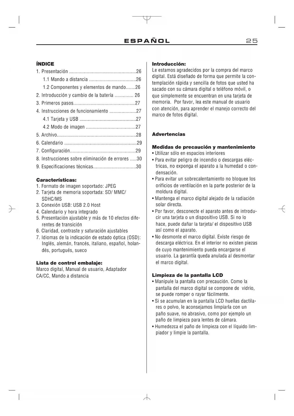 Inglés, alemán, francés, italiano, español, holan- dés, portugués, sueco Lista de control embalaje: Marco digital, Manual de usuario, Adaptador CA/CC, Mando a distancia Introducción: Le estamos agradecidos por la compra del marco digital. Está diseñado de forma que permite la con- templación rápida y sencilla de fotos que usted ha sacado con su cámara digital o teléfono móvil, o que simplemente se encuentran en una tarjeta de memoria. Por favor, lea este manual de usuario con atención, para aprender el manejo correcto del marco de fotos digital. Advertencias Medidas de precaución y mantenimiento