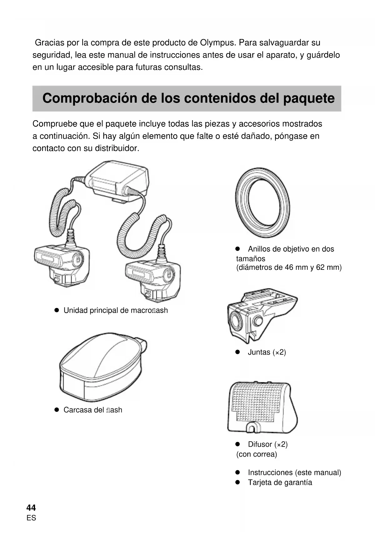 Gracias por la compra de este producto de Olympus. Para salvaguardar su seguridad, lea este manual de instrucciones antes de usar el aparato, y guárdelo en un lugar accesible para futuras consultas. Comprobación de los contenidos del paquete Compruebe que el paquete incluye todas las piezas y accesorios mostrados a continuación. Si hay algún elemento que falte o esté dañado, póngase en contacto con su distribuidor. Instrucciones (este manual) Tarjeta de garantía Unidad principal de macrofl ash Carcasa del fl ash Anillos de objetivo en dos tamaños (diámetros de 46 mm y 62 mm) Juntas (×2) Difusor (×2) (con correa)45