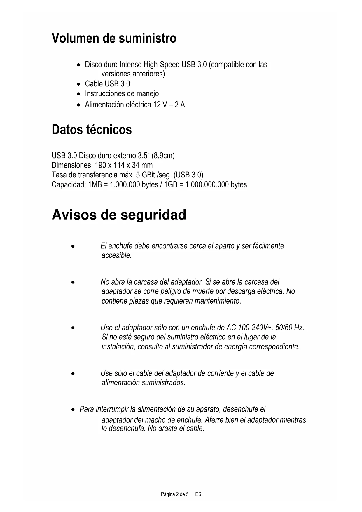 Conecte el bloque de alimentación suministrado con el disco duro externo. Conecte el otro extremo del bloque de alimentación en el enchufe. Para poner en marcha, presione entonces apagado/encendido ( I / 0 ) en la parte frontal de la caja. Para conectar el disco duro a su ordenador, utilice por favor únicamente el cable USB suministrado. Conecte el enchufe USB 3.0 tipo B con el disco duro Intenso y el enchufe USB 3.0 tipo A del extremo del cable, con su ordenador. El computador reconoce el „Hardware nuevo“ e instala automáticamente los drivers. Espere hasta que la instalación de los drivers haya finalizado. Ahora estará disponible en „Mi PC“ una unidad de disco con el nombre „Intenso“. Inmediatamente luego de conectar el disco duro externo con su computador se ilumina el piloto LED. El piloto LED parpadea, cuando se realiza un proceso de escritura o lectura. Marca registrada: Windows XP / Vista / Windows 7 son marcas registradas de Microsoft Corporation. Macintosh y MAC son marcas registradas de Apple Computer. Todas las marcas y nombres de terceros son propiedad del usuario correspondiente.Página 5 de 5 ES Condiciones limitadas de garantía La garantía sólo cubre la sustitución de este producto Intenso. La garantía no cubre muestras normales de desgaste producidas por un uso erróneo o inadecuado, por negligencia, accidente, incompatibilidad, o por el funcionamiento defectuoso de un hardware o software informático. No existe derecho a garantía si no se siguen las instrucciones de uso de Intenso, así como en caso de montaje o uso inadecuado, o por daños producidos por otros aparatos defectuosos. No existe derecho a garantía, si el producto ha recibido sacudidas, descargas eléctricas, o si ha sido expuesto a fuentes de calor o de humedad no conformes a las especificaciones de estas instrucciones de uso. Intenso no se responsabiliza por la pérdida de datos o daño colaterales o como consecuencia de estos, ni de la violación de las condiciones de garantía, ni de otros daños, independientemente de la causa. Advertencia importante: Recuerde que se extingue cualquier derecho a garantía, si el adhesivo de capacidad (= sello de garantía) sur el dorso està dañado o si se abre la carcasa del disco duro. Este producto no es concebido para uso comercial o aplicaciones médicas y especiales, en los que los fallos del producto, pueden causar lesiones, la muerte o considerables daños colaterales.Página 1 de 5 PT