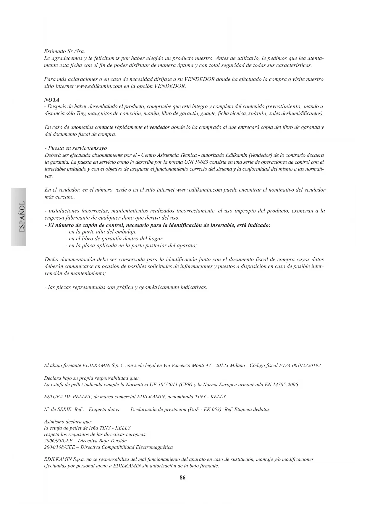 Glasskamin (code 155240) Utile pour le nettoyage de la vitre céramique Bidon pour aspirer les Utile pour le nettoyage du foyer86 ESPAÑOL El abajo firmante EDILKAMIN S.p.A. con sede legal en Via Vincenzo Monti 47 - 20123 Milano - Código fiscal P.IVA 00192220192 Declara bajo su propia responsabilidad que: La estufa de pellet indicada cumple la Normativa UE 305/2011 (CPR) y la Norma Europea armonizada EN 14785:2006 ESTUFA DE PELLET, de marca comercial EDILKAMIN, denominada TINY - KELLY N° de SERIE: Ref:. Etiqueta datos Declaración de prestación (DoP - EK 053): Ref. Etiqueta dedatos Asimismo declara que: la estufa de pellet de leña TINY - KELLY respeta los requisitos de las directivas europeas: 2006/95/CEE – Directiva Baja Tensión 2004/108/CEE – Directiva Compatibilidad Electromagnética EDILKAMIN S.p.a. no se responsabiliza del mal funcionamiento del aparato en caso de sustitución, montaje y/o modificaciones efectuadas por personal ajeno a EDILKAMIN sin autorización de la bajo firmante. Estimado Sr./Sra. Le agradecemos y le felicitamos por haber elegido un producto nuestro. Antes de utilizarlo, le pedimos que lea atenta- mente esta ficha con el fin de poder disfrutar de manera óptima y con total seguridad de todas sus características. Para más aclaraciones o en caso de necesidad diríjase a su VENDEDOR donde ha efectuado la compra o visite nuestro sitio internet www.edilkamin.com en la opción VENDEDOR. NOTA - Después de haber desembalado el producto, compruebe que esté íntegro y completo del contenido (revestimiento, mando a distancia sólo Tiny, manguitos de conexión, manija, libro de garantía, guante, ficha técnica, spátula, sales deshumidificantes). En caso de anomalías contacte rápidamente el vendedor donde lo ha comprado al que entregará copia del libro de garantía y del documento fiscal de compra. - Puesta en servico/ensayo Deberá ser efectuada absolutamente por el - Centro Asistencia Técnica - autorizado Edilkamin (Vendedor) de lo contrario decaerá la garantía. La puesta en servicio como lo describe por la norma UNI 10683 consiste en una serie de operaciones de control con el insertable instalado y con el objetivo de asegurar el funcionamiento correcto del sistema y la conformidad del mismo a las normati- vas. En el vendedor, en el número verde o en el sitio internet www.edilkamin.com puede encontrar el nominativo del vendedor más cercano. - instalaciones incorrectas, mantenimientos realizados incorrectamente, el uso impropio del producto, exoneran a la empresa fabricante de cualquier daño que deriva del uso. - El número de cupón de control, necesario para la identificación de insertable, está indicado: - en la parte alta del embalaje - en el libro de garantía dentro del hogar - en la placa aplicada en la parte posterior del aparato; Dicha documentación debe ser conservada para la identificación junto con el documento fiscal de compra cuyos datos deberán comunicarse en ocasión de posibles solicitudes de informaciones y puestos a disposición en caso de posible inter- vención de mantenimiento; - las piezas representadas son gráfica y geométricamente indicativas.87 ESPAÑOL