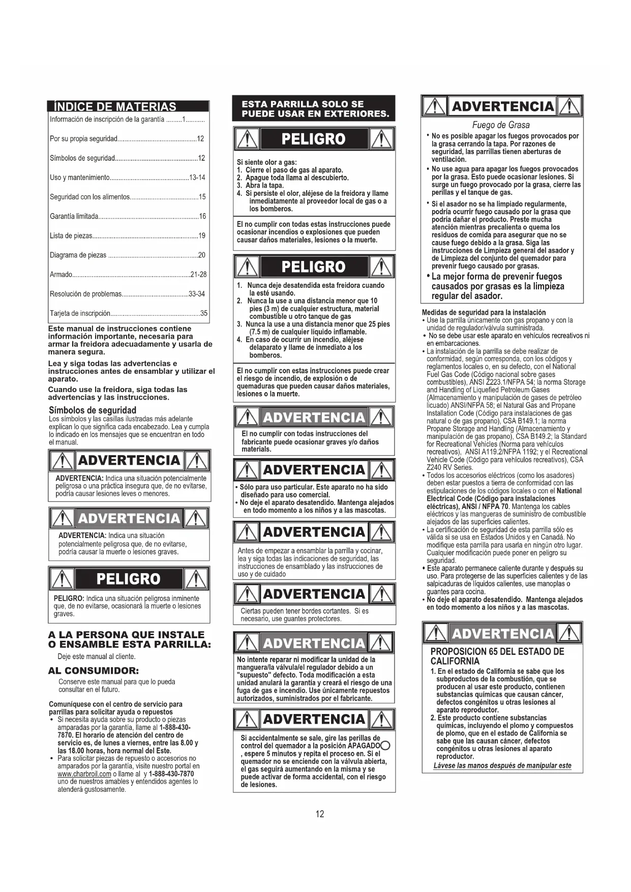 Portée de la couverture Période de couverture Type de défaillances couvertes Brûleur en acier inoxydable À feu et couvercle Reste des pièces 2 ans à compter de la date d'achat * 1 an à compter de la date d'achat * Perforation, Défauts de fabrication et de matériel Uniquement 5 ans à compter de la date d'achat * 11ESTA PARRILLA SOLO SE PUEDE USAR EN EXTERIORES. PELIGRO Símbolos de seguridad Los símbolos y las casillas ilustradas más adelante explican lo que significa cada encabezado. Lea y cumpla lo indicado en los mensajes que se encuentran en todo el manual.PELIGRO: Indica una situación peligrosa inminente que, de no evitarse, ocasionará la muerte o lesiones graves. ADVERTENCIA ADVERTENCIA: Indica una situación potencialmente peligrosa que, de no evitarse, podría causar la muerte o lesiones graves. ADVERTENCIA ADVERTENCIA: Indica una situación potencialmente peligrosa o una práctica insegura que, de no evitarse, podría causar lesiones leves o menores. PELIGRO El no cumplir con todas instrucciones del fabricante puede ocasionar graves y/o daños materials.Antes de empezar a ensamblar la parrilla y cocinar, lea y siga todas las indicaciones de seguridad, las instrucciones de ensamblado y las instrucciones de uso y de cuidado Ciertas pueden tener bordes cortantes. Si es necesario, use guantes protectores. A LA PERSONA QUE INSTALE O ENSAMBLE ESTA PARRILLA:Deje este manual al cliente.AL CONSUMIDOR:Conserve este manual para que lo pueda consultar en el futuro. PELIGRO ADVERTENCIA PELIGRO ADVERTENCIA PELIGRO ADVERTENCIA PELIGRO ADVERTENCIA ADVERTENCIA PROPOSICION 65 DEL ESTADO DE CALIFORNIA 1. En el estado de California se sabe que los subproductos de la combustión, que se producen al usar este producto, contienen substancias químicas que causan cáncer, defectos congénitos u otras lesiones al aparato reproductor.2. Este producto contiene substancias químicas, incluyendo el plomo y compuestos de plomo, que en el estado de California se sabe que las causan cáncer, defectos congénitos u otras lesiones al aparato reproductor.Lávese las manos después de manipular este No intente reparar ni modificar la unidad de la manguera/la válvula/el regulador debido a un "supuesto" defecto. Toda modificación a esta unidad anulará la garantía y creará el riesgo de una fuga de gas e incendio. Use únicamente repuestos autorizados, suministrados por el fabricante. ADVERTENCIA PELIGRO ADVERTENCIA Fuego de Grasa