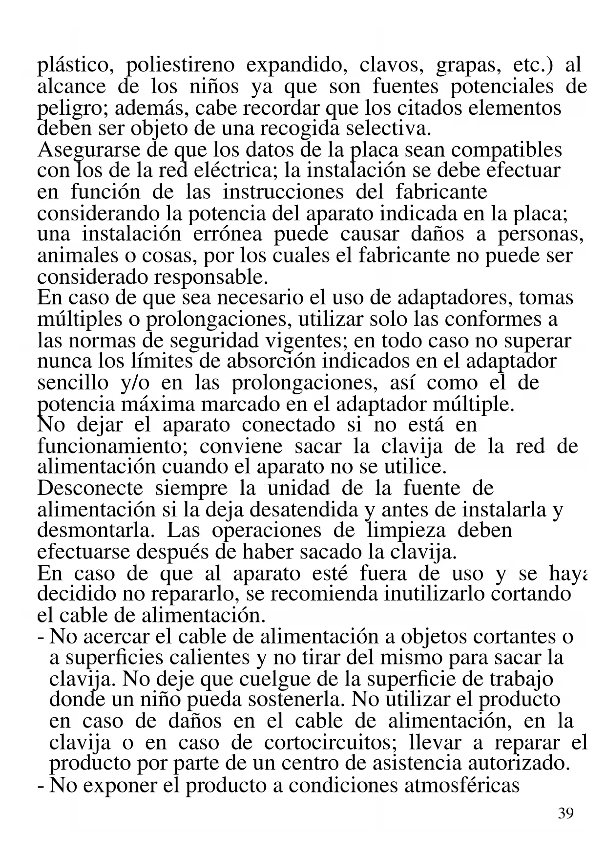 A continuación se presentan importantes indicaciones sobre la instalación, el uso y el mantenimiento. Conservar con cuidado este manual para cualquier consulta posterior; utilizar el producto solo de la manera que indica este manual de instrucciones; cualquier otro uso se considera inadecuado y peligroso; por ello el fabricante no puede ser considerado responsable en caso de que se produzcan daños derivados de usos inadecuados, erróneos o irracionales. Antes del uso asegurarse de la integridad del aparato; en caso de duda no utilizarlo y dirigirse al personal de asistencia; no dejar los elementos del embalaje (bolsas de39 plástico, poliestireno expandido, clavos, grapas, etc.) al alcance de los niños ya que son fuentes potenciales de peligro; además, cabe recordar que los citados elementos deben ser objeto de una recogida selectiva. Asegurarse de que los datos de la placa sean compatibles con los de la red eléctrica; la instalación se debe efectuar en función de las instrucciones del fabricante considerando la potencia del aparato indicada en la placa; una instalación errónea puede causar daños a personas, animales o cosas, por los cuales el fabricante no puede ser considerado responsable. En caso de que sea necesario el uso de adaptadores, tomas múltiples o prolongaciones, utilizar solo las conformes a las normas de seguridad vigentes; en todo caso no superar nunca los límites de absorción indicados en el adaptador sencillo y/o en las prolongaciones, así como el de potencia máxima marcado en el adaptador múltiple. No dejar el aparato conectado si no está en funcionamiento; conviene sacar la clavija de la red de alimentación cuando el aparato no se utilice. Desconecte siempre la unidad de la fuente de alimentación si la deja desatendida y antes de instalarla y desmontarla. Las operaciones de limpieza deben efectuarse después de haber sacado la clavija. En caso de que al aparato esté fuera de uso y se haya decidido no repararlo, se recomienda inutilizarlo cortando el cable de alimentación. - No acercar el cable de alimentación a objetos cortantes o a superficies calientes y no tirar del mismo para sacar la clavija. No deje que cuelgue de la superficie de trabajo donde un niño pueda sostenerla. No utilizar el producto en caso de daños en el cable de alimentación, en la clavija o en caso de cortocircuitos; llevar a reparar el producto por parte de un centro de asistencia autorizado. - No exponer el producto a condiciones atmosféricas40 - adversas como lluvia, humedad, hielo, etc. Conservarlo en lugares secos. No manejar o tocar el producto con las manos húmedas o los pies descalzos. - Este aparato no debe ser usado por niños, incluso si son mayores de 8 años. - Este aparato puede ser utilizado por personas con capacidades físicas, sensoriales o mentales reducidas o con falta de experiencia o conocimiento si a dichas personas se ha asegurado una supervisión o bien si han recibido instrucciones sobre el uso seguro del aparato. - Los niños no deben jugar con el aparato. - Mantener el producto y el cable fuera del alcance de los niños menores de 8 años. - No apto para uso comercial. Solo para uso doméstico En caso de avería y/o de funcionamiento anómalo no manipular el aparato. Para una posible reparación, dirigirse únicamente a un centro autorizado por el fabricante y solicitar el uso de recambios originales. El incumplimiento de lo indicado anteriormente puede comprometer la seguridad del aparato y anular las condiciones de la garantía. Antes de cada uso, desenrolle el cable de alimentación. ATENCIÓN: el producto tiene una función de calentamiento. Las superficies pueden desarrollar altas temperaturas. La percepción de la temperatura es distinta para cada persona, utilizar el aparato con cautela. Tocar solo las superficies diseñadas para ser tocadas, y usar agarradores o guantes de cocina. Este aparato está diseñado para uso doméstico o similares: cocinas para el personal de tiendas, oficinas u otros centros de trabajo, para clientes de hoteles, moteles, hostales y similares. El aparato no está diseñado para su uso a través de temporizadores externos o mandos a distancia. Utilice únicamente piezas de repuesto y accesorios41 originales. No someta el producto a impactos fuertes se producirán daños serios. Mantenga la unidad lejos de materiales inflamables, calor, puntos fríos y vapor.