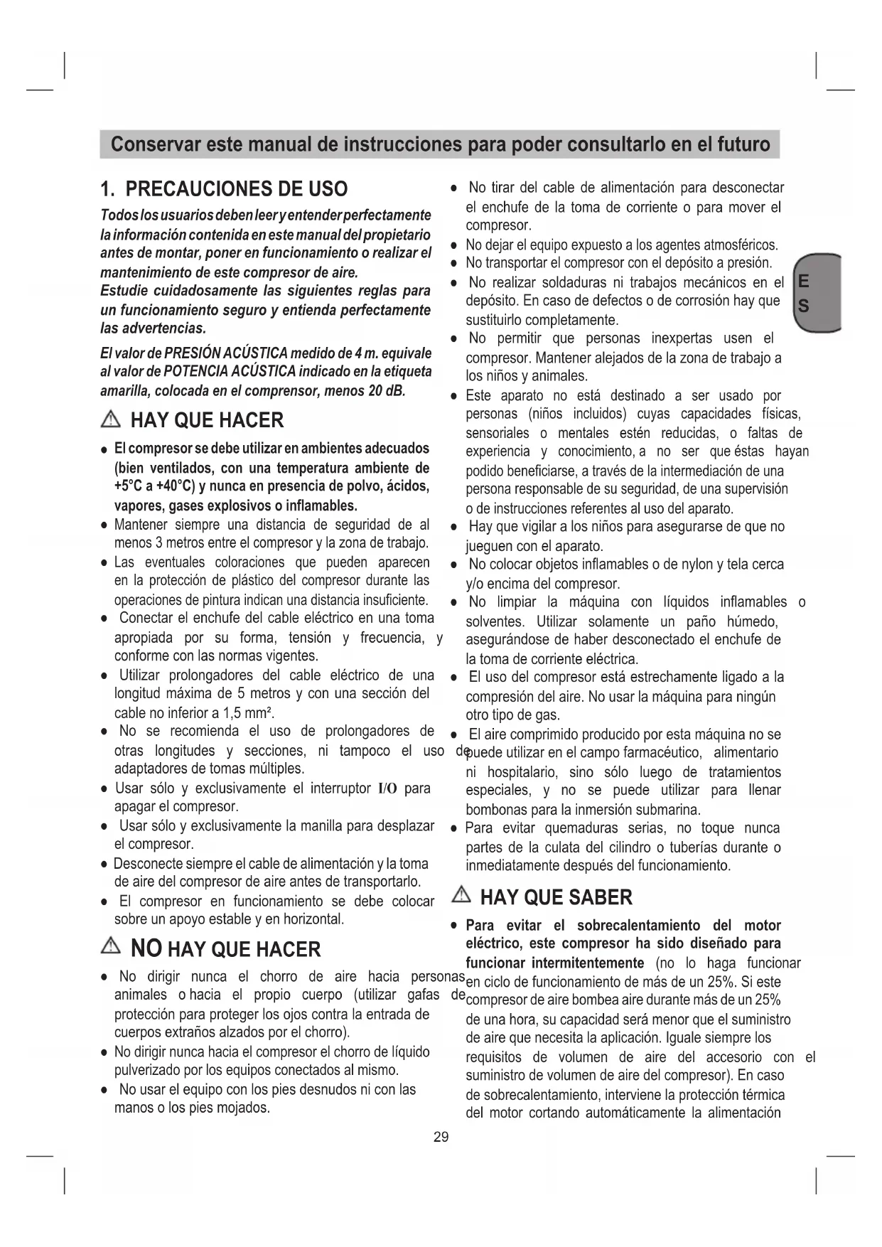 Todos los usuarios deben leer y entender perfectamente la información contenida en este manual del propietario antes de montar, poner en funcionamiento o realizar el mantenimiento de este compresor de aire. Estudie cuidadosamente las siguientes reglas para un funcionamiento seguro y entienda perfectamente las advertencias. El valor de PRESIÓN ACÚSTICA medido de 4 m. equivale al valor de POTENCIA ACÚSTICA indicado en la etiqueta amarilla, colocada en el comprensor, menos 20 dB.
