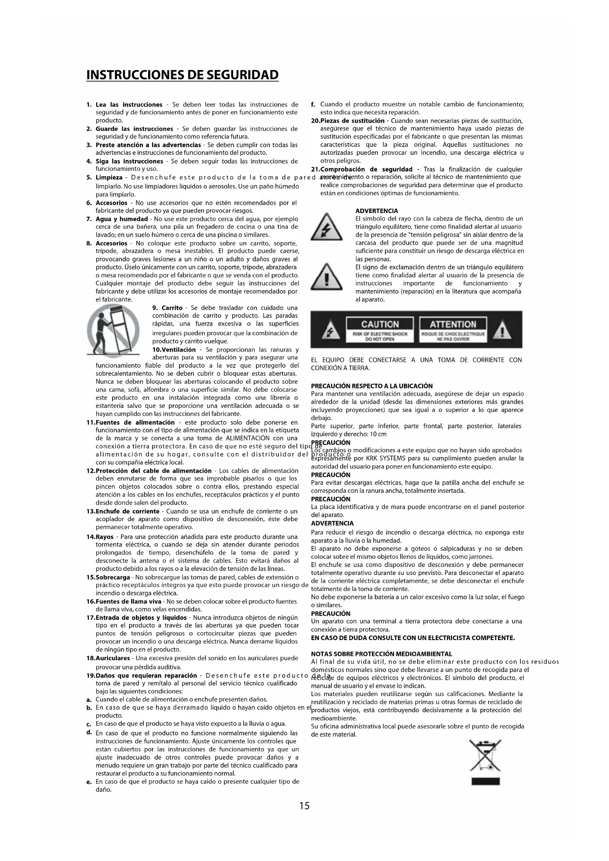 EL EQUIPO DEBE CONECTARSE A UNA TOMA DE CORRIENTE CON CONEXIÓN A TIERRA. PRECAUCIÓN RESPECTO A LA UBICACIÓN Para mantener una ventilación adecuada, asegúrese de dejar un espacio alrededor de la unidad (desde las dimensiones exteriores más grandes incluyendo proyecciones) que sea igual a o superior a lo que aparece debajo. Parte superior, parte inferior, parte frontal, parte posterior, laterales izquierdo y derecho: 10 cm PRECAUCIÓN Los cambios o modificaciones a este equipo que no hayan sido aprobados expresamente por KRK SYSTEMS para su cumplimiento pueden anular la autoridad del usuario para poner en funcionamiento este equipo. PRECAUCIÓN Para evitar descargas eléctricas, haga que la patilla ancha del enchufe se corresponda con la ranura ancha, totalmente insertada. PRECAUCIÓN La placa identificativa y de mara puede encontrarse en el panel posterior del aparato. ADVERTENCIA Para reducir el riesgo de incendio o descarga eléctrica, no exponga este aparato a la lluvia o la humedad. El aparato no debe exponerse a goteos o salpicaduras y no se deben colocar sobre el mismo objetos llenos de líquidos, como jarrones. El enchufe se usa como dispositivo de desconexión y debe permanecer totalmente operativo durante su uso previsto. Para desconectar el aparato de la corriente eléctrica completamente, se debe desconectar el enchufe totalmente de la toma de corriente. No debe exponerse la batería a un calor excesivo como la luz solar, el fuego o similares. PRECAUCIÓN Un aparato con una terminal a tierra protectora debe conectarse a una conexión a tierra protectora. EN CASO DE DUDA CONSULTE CON UN ELECTRICISTA COMPETENTE.