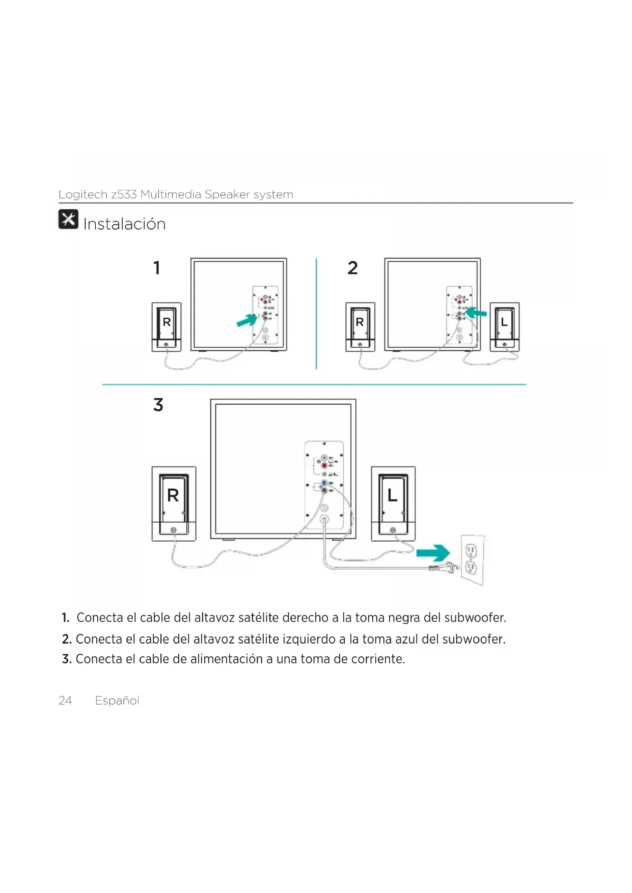 3. Conecta el cable de alimentación a una toma de corriente.Logitech z533 Multimedia Speaker system