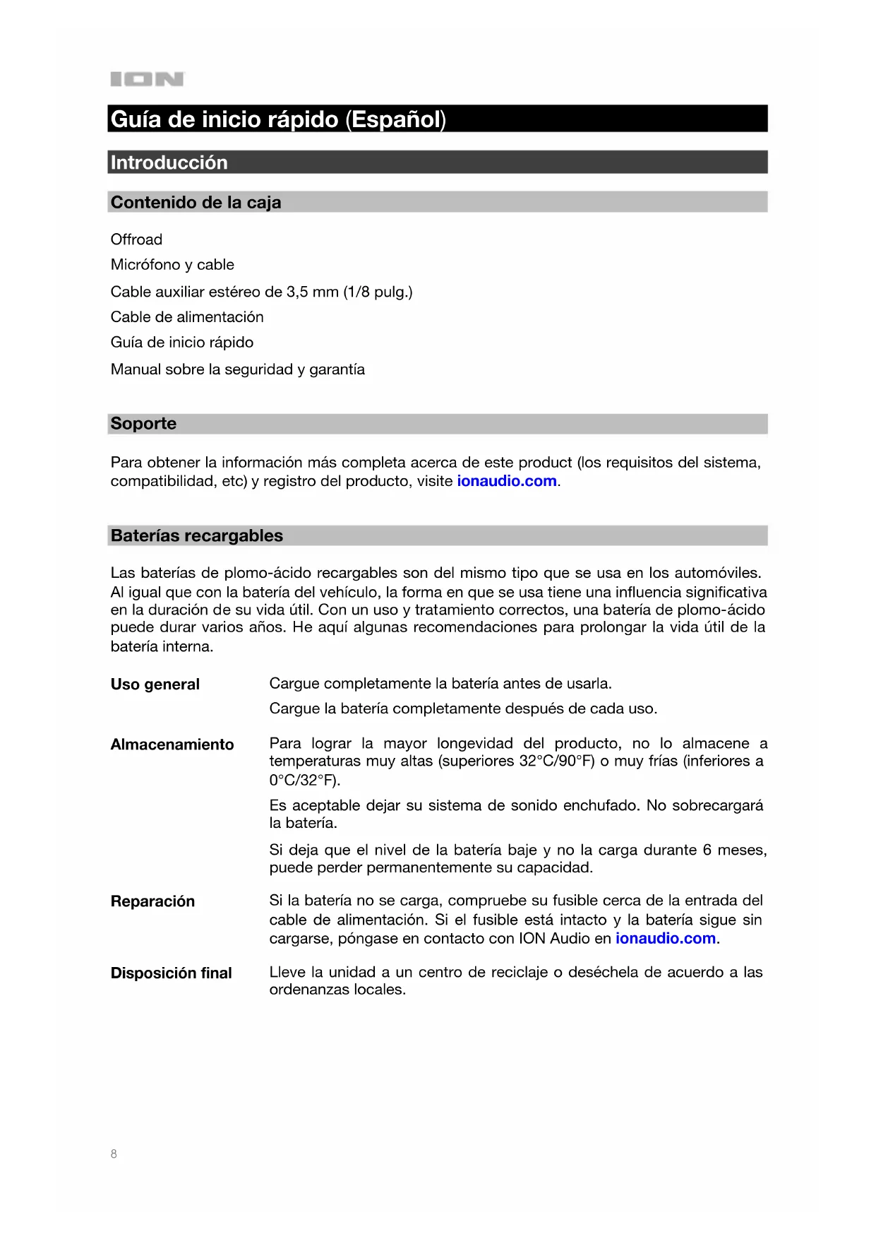 Baterías recargables Las baterías de plomo-ácido recargables son del mismo tipo que se usa en los automóviles. Al igual que con la batería del vehículo, la forma en que se usa tiene una influencia significativa en la duración de su vida útil. Con un uso y tratamiento correctos, una batería de plomo-ácido puede durar varios años. He aquí algunas recomendaciones para prolongar la vida útil de la batería interna. Uso general Cargue completamente la batería antes de usarla. Cargue la batería completamente después de cada uso. Almacenamiento Para lograr la mayor longevidad del producto, no lo almacene a temperaturas muy altas (superiores 32°C/90°F) o muy frías (inferiores a 0°C/32°F). Es aceptable dejar su sistema de sonido enchufado. No sobrecargará la batería. Si deja que el nivel de la batería baje y no la carga durante 6 meses, puede perder permanentemente su capacidad. Reparación Si la batería no se carga, compruebe su fusible cerca de la entrada del cable de alimentación. Si el fusible está intacto y la batería sigue sin cargarse, póngase en contacto con ION Audio en ionaudio.com. Disposición final Lleve la unidad a un centro de reciclaje o deséchela de acuerdo a las ordenanzas locales.9