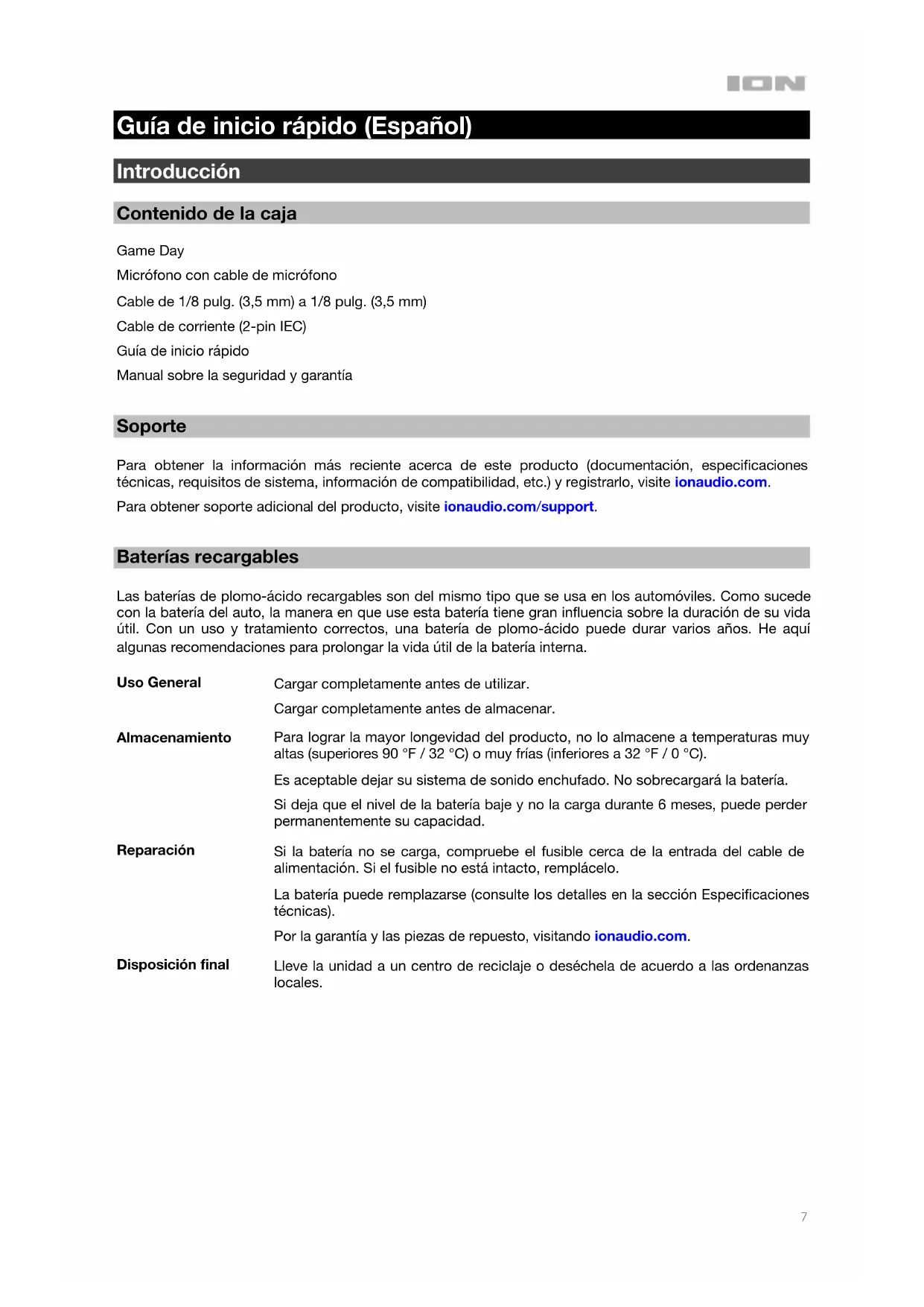 Guía de inicio rápido (Español) Introducción Contenido de la caja Game Day Micrófono con cable de micrófono Cable de 1/8 pulg. (3,5 mm) a 1/8 pulg. (3,5 mm) Cable de corriente (2-pin IEC) Guía de inicio rápido Manual sobre la seguridad y garantía Soporte Para obtener la información más reciente acerca de este producto (documentación, especificaciones técnicas, requisitos de sistema, información de compatibilidad, etc.) y registrarlo, visite ionaudio.com. Para obtener soporte adicional del producto, visite ionaudio.com/support. Baterías recargables Las baterías de plomo-ácido recargables son del mismo tipo que se usa en los automóviles. Como sucede con la batería del auto, la manera en que use esta batería tiene gran influencia sobre la duración de su vida útil. Con un uso y tratamiento correctos, una batería de plomo-ácido puede durar varios años. He aquí algunas recomendaciones para prolongar la vida útil de la batería interna. Uso General Cargar completamente antes de utilizar. Cargar completamente antes de almacenar. Almacenamiento Para lograr la mayor longevidad del producto, no lo almacene a temperaturas muy altas (superiores 90 °F / 32 °C) o muy frías (inferiores a 32 °F / 0 °C). Es aceptable dejar su sistema de sonido enchufado. No sobrecargará la batería. Si deja que el nivel de la batería baje y no la carga durante 6 meses, puede perder permanentemente su capacidad. Reparación Si la batería no se carga, compruebe el fusible cerca de la entrada del cable de alimentación. Si el fusible no está intacto, remplácelo. La batería puede remplazarse (consulte los detalles en la sección Especificaciones técnicas). Por la garantía y las piezas de repuesto, visitando ionaudio.com. Disposición final Lleve la unidad a un centro de reciclaje o deséchela de acuerdo a las ordenanzas locales.8