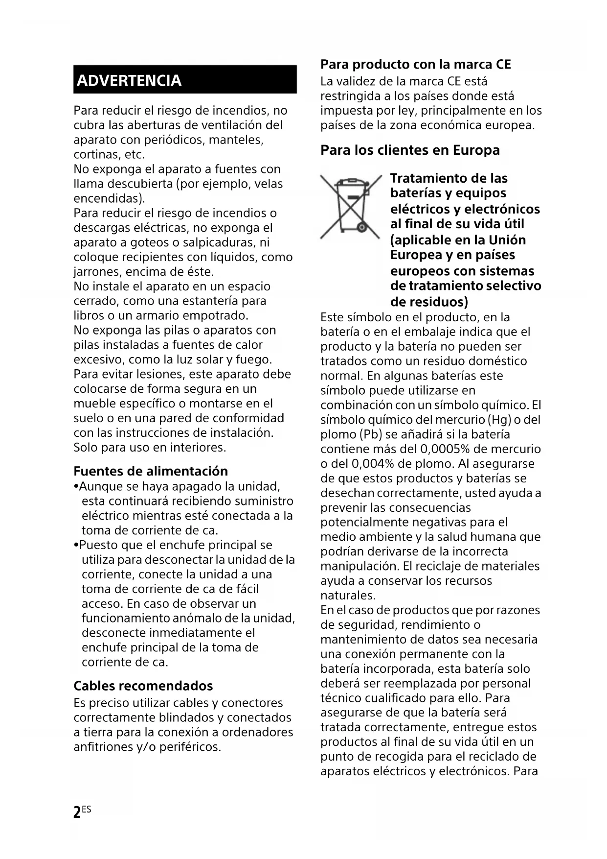 En el caso de produits que por razones de seguridad, rendimiento o mantenimiento de datos sea necesaria una conexión permanente con la bateria incorpora, esta bateria solo deben ser reemplazada por personal的技术icoriallicado paraarlo. Para asegurarde que la bateria sera tratada correctamente,entarque这些 products al final de su vidautil en un punto de recogida para el reciclado de aparatos electricos y electronicos. Para