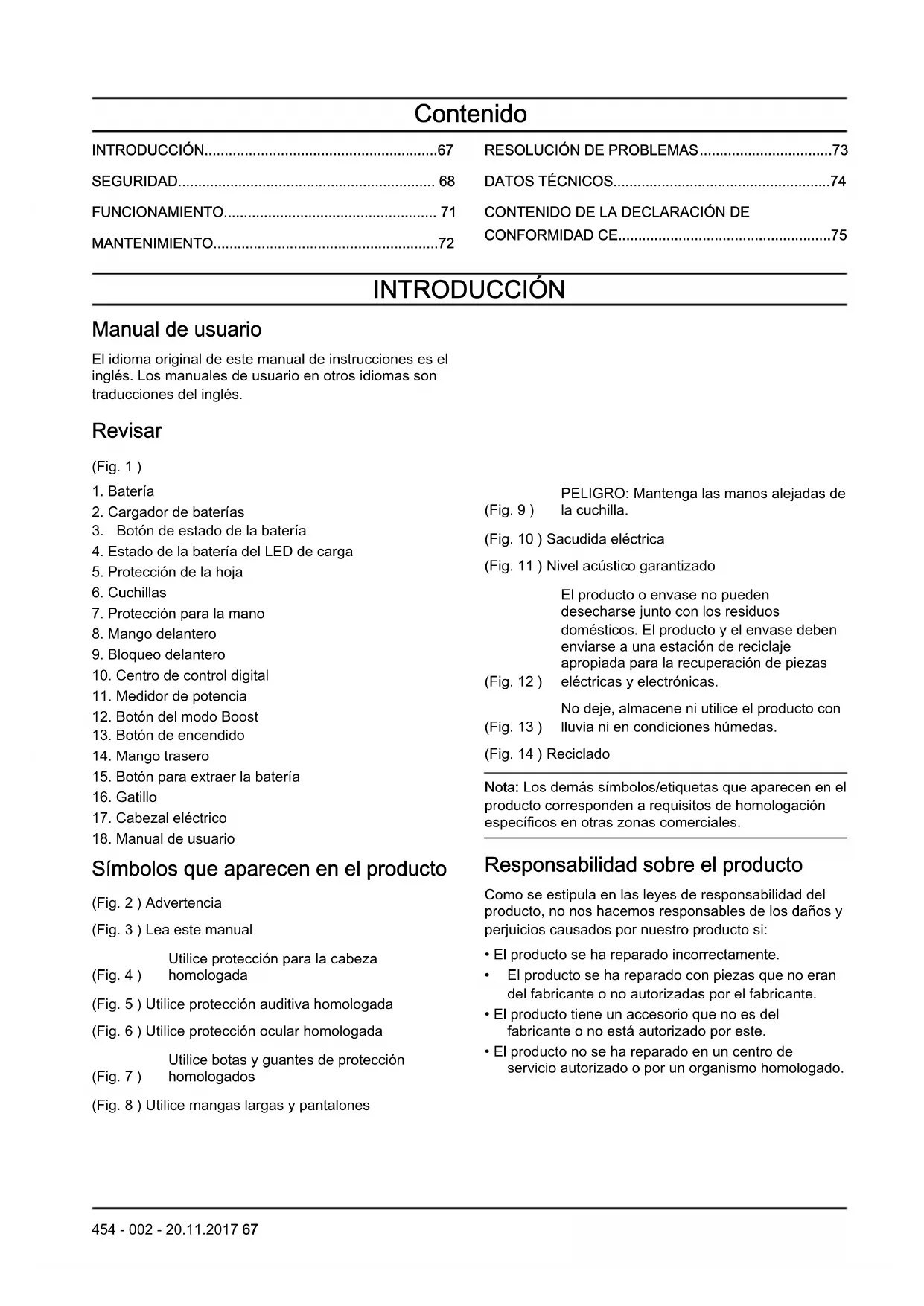 Símbolos que aparecen en el producto (Fig. 2 ) Advertencia (Fig. 3 ) Lea este manual (Fig. 4 ) Utilice protección para la cabeza homologada (Fig. 5 ) Utilice protección auditiva homologada (Fig. 6 ) Utilice protección ocular homologada (Fig. 7 ) Utilice botas y guantes de protección homologados (Fig. 8 ) Utilice mangas largas y pantalones (Fig. 9 ) PELIGRO: Mantenga las manos alejadas de la cuchilla. (Fig. 10 ) Sacudida eléctrica (Fig. 11 ) Nivel acústico garantizado (Fig. 12 ) El producto o envase no pueden desecharse junto con los residuos domésticos. El producto y el envase deben enviarse a una estación de reciclaje apropiada para la recuperación de piezas eléctricas y electrónicas. (Fig. 13 ) No deje, almacene ni utilice el producto con lluvia ni en condiciones húmedas. (Fig. 14 ) Reciclado Nota: Los demás símbolos/etiquetas que aparecen en el producto corresponden a requisitos de homologación específicos en otras zonas comerciales. Responsabilidad sobre el producto Como se estipula en las leyes de responsabilidad del producto, no nos hacemos responsables de los daños y perjuicios causados por nuestro producto si: