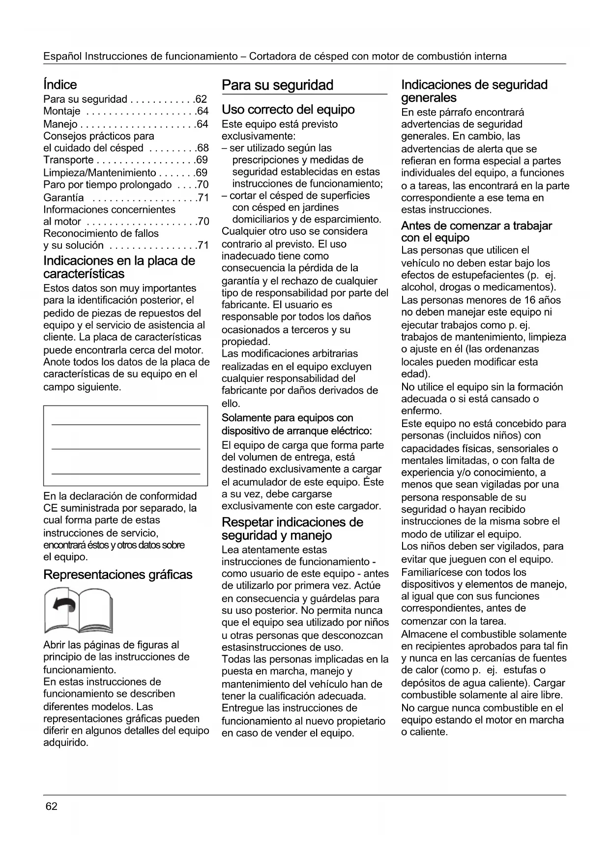 - Reconocimiento de fallos y su solución Indicaciones en la placa de características Estos datos son muy importantes para la identificación posterior, el pedido de piezas de repuestos del equipo y el servicio de asistencia al cliente. La placa de características puede encontrarla cerca del motor. Anote todos los datos de la placa de características de su equipo en el campo siguiente. En la declaración de conformidad CE suministrada por separado, la cual forma parte de estas instrucciones de servicio, encontrará éstos y otros datos sobre el equipo. Representaciones gráficas Abrir las páginas de figuras al principio de las instrucciones de funcionamiento. En estas instrucciones de funcionamiento se describen diferentes modelos. Las representaciones gráficas pueden diferir en algunos detalles del equipo adquirido. Para su seguridad Uso correcto del equipo Este equipo está previsto exclusivamente: – ser utilizado según las prescripciones y medidas de seguridad establecidas en estas instrucciones de funcionamiento; – cortar el césped de superficies con césped en jardines domiciliarios y de esparcimiento. Cualquier otro uso se considera contrario al previsto. El uso inadecuado tiene como consecuencia la pérdida de la garantía y el rechazo de cualquier tipo de responsabilidad por parte del fabricante. El usuario es responsable por todos los daños ocasionados a terceros y su propiedad. Las modificaciones arbitrarias realizadas en el equipo excluyen cualquier responsabilidad del fabricante por daños derivados de ello. Solamente para equipos con dispositivo de arranque eléctrico: El equipo de carga que forma parte del volumen de entrega, está destinado exclusivamente a cargar el acumulador de este equipo. Éste a su vez, debe cargarse exclusivamente con este cargador. Respetar indicaciones de seguridad y manejo Lea atentamente estas instrucciones de funcionamiento - como usuario de este equipo - antes de utilizarlo por primera vez. Actúe en consecuencia y guárdelas para su uso posterior. No permita nunca que el equipo sea utilizado por niños u otras personas que desconozcan estasinstrucciones de uso. Todas las personas implicadas en la puesta en marcha, manejo y mantenimiento del vehículo han de tener la cualificación adecuada. Entregue las instrucciones de funcionamiento al nuevo propietario en caso de vender el equipo. Indicaciones de seguridad generales En este párrafo encontrará advertencias de seguridad generales. En cambio, las advertencias de alerta que se refieran en forma especial a partes individuales del equipo, a funciones o a tareas, las encontrará en la parte correspondiente a ese tema en estas instrucciones. Antes de comenzar a trabajar con el equipo Las personas que utilicen el vehículo no deben estar bajo los efectos de estupefacientes (p. ej. alcohol, drogas o medicamentos). Las personas menores de 16 años no deben manejar este equipo ni ejecutar trabajos como p. ej. trabajos de mantenimiento, limpieza o ajuste en él (las ordenanzas locales pueden modificar esta edad). No utilice el equipo sin la formación adecuada o si está cansado o enfermo. Este equipo no está concebido para personas (incluidos niños) con capacidades físicas, sensoriales o mentales limitadas, o con falta de experiencia y/o conocimiento, a menos que sean vigiladas por una persona responsable de su seguridad o hayan recibido instrucciones de la misma sobre el modo de utilizar el equipo. Los niños deben ser vigilados, para evitar que jueguen con el equipo. Familiarícese con todos los dispositivos y elementos de manejo, al igual que con sus funciones correspondientes, antes de comenzar con la tarea. Almacene el combustible solamente en recipientes aprobados para tal fin y nunca en las cercanías de fuentes de calor (como p. ej. estufas o depósitos de agua caliente). Cargar combustible solamente al aire libre. No cargue nunca combustible en el equipo estando el motor en marcha o caliente.Instrucciones de funcionamiento – Cortadora de césped con motor de combustión interna Español p. 71