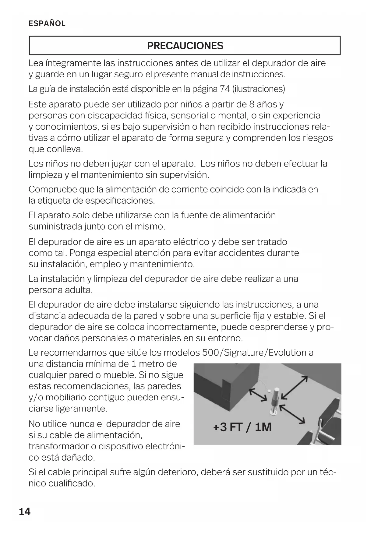ET EVOLUTION: Pour la garantie, consulter www.lifeair.com14 PRECAUCIONES Lea íntegramente las instrucciones antes de utilizar el depurador de aire y guarde en un lugar seguro el presente manual de instrucciones. La guía de instalación está disponible en la página 74 (ilustraciones) Este aparato puede ser utilizado por niños a partir de 8 años y personas con discapacidad física, sensorial o mental, o sin experiencia y conocimientos, si es bajo supervisión o han recibido instrucciones rela- tivas a cómo utilizar el aparato de forma segura y comprenden los riesgos que conlleva. Los niños no deben jugar con el aparato. Los niños no deben efectuar la limpieza y el mantenimiento sin supervisión. Compruebe que la alimentación de corriente coincide con la indicada en la etiqueta de especicaciones. El aparato solo debe utilizarse con la fuente de alimentación suministrada junto con el mismo. El depurador de aire es un aparato eléctrico y debe ser tratado como tal. Ponga especial atención para evitar accidentes durante su instalación, empleo y mantenimiento. La instalación y limpieza del depurador de aire debe realizarla una persona adulta. El depurador de aire debe instalarse siguiendo las instrucciones, a una distancia adecuada de la pared y sobre una supercie ja y estable. Si el depurador de aire se coloca incorrectamente, puede desprenderse y pro- vocar daños personales o materiales en su entorno. Le recomendamos que sitúe los modelos 500/Signature/Evolution a una distancia mínima de 1 metro de cualquier pared o mueble. Si no sigue estas recomendaciones, las paredes y/o mobiliario contiguo pueden ensu- ciarse ligeramente. No utilice nunca el depurador de aire si su cable de alimentación, transformador o dispositivo electróni- co está dañado. Si el cable principal sufre algún deterioro, deberá ser sustituido por un téc- nico cualicado. +3 FT / 1M ESPAÑOL15 ESPAÑOL No introduzca el depurador de aire (ni el transformador tampoco) en agua u otro líquido, a n de evitar descargas eléctricas, incendios, lesiones y demás peligros. No coloque el depurador de aire ni su cable cerca de una fuente de calor. No utilice el depurador de aire en el exterior. No utilice el depurador de aire en estancias húmedas. No utilice el depurador de aire junto con velas de colores o a base de aceite, puesto que emiten hollín que podría adherirse a paredes y muebles. Es posible que experimente una pequeña descarga eléctrica al tocar el colec- tor, que es completamente inofensiva. Si le produce desagrado, desconecte el aparato antes de manipularlo y emplee la cubierta protectora cuando esté activado. Recuerde que la cubierta protectora es opcional, no resultando necesaria desde el punto de vista de la seguridad. Nota: LifeAir se exime de toda responsabilidad por cualquier daño resul- tante de la no observación de sus recomendaciones.16 ESPAÑOL Antes de limpiar, DEBE desconectar la aliment- ación eléctrica y apagar el depurador de aire. NO lave el colector en el lavavajillas. NO emplee productos de limpieza que contengan soluciones de alcohol, amoníaco o sustancias alcalinas, ya que pueden dañar el depurador de aire. El colector debe limpiarse aproximadamente cada dos semanas y siempre que resulte necesario. Si opera en entornos de alta con- taminación, puede precisarse una limpieza más frecuente. Limpieza del colector: