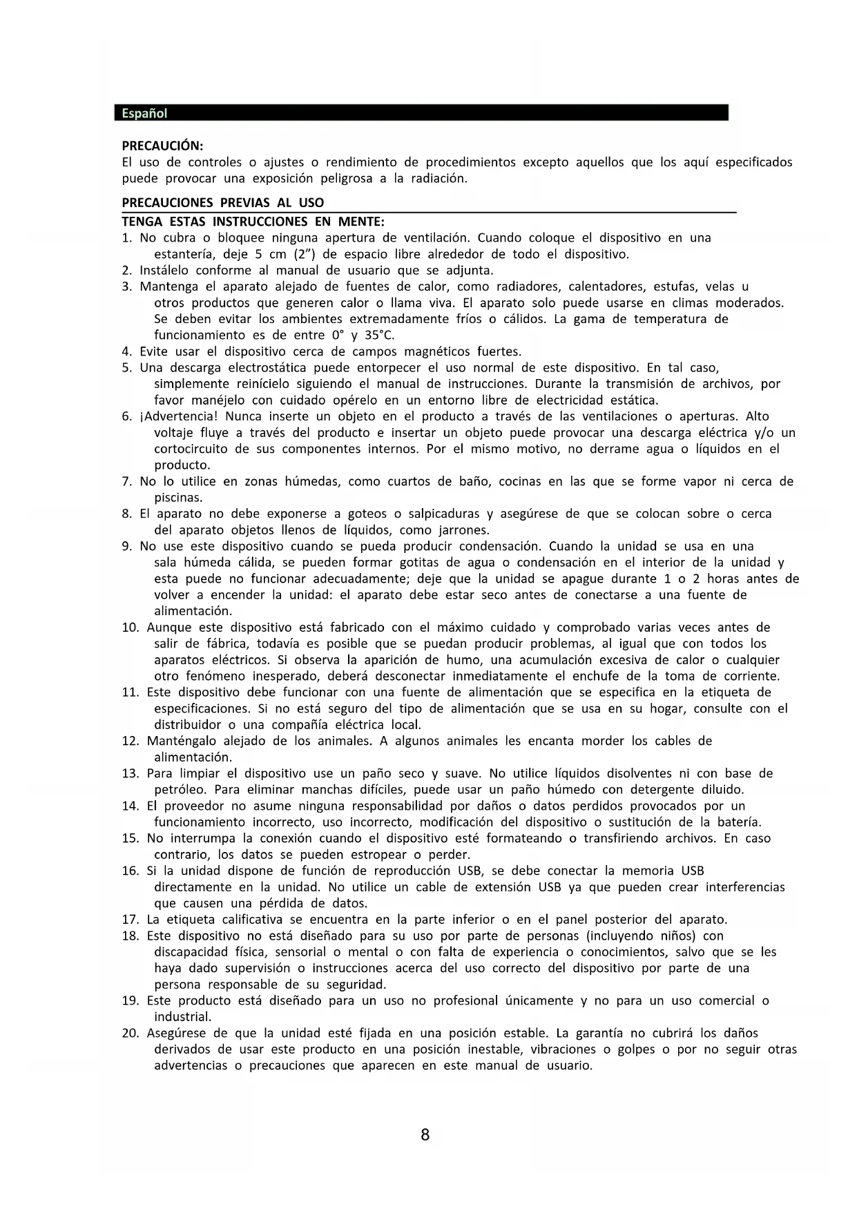 derivados de usar este producto en una posición inestable, vibraciones o golpes o por no seguir otras advertencias o precauciones que aparecen en este manual de usuario. 8821. Nunca retire la carcasa del dispositivo.
