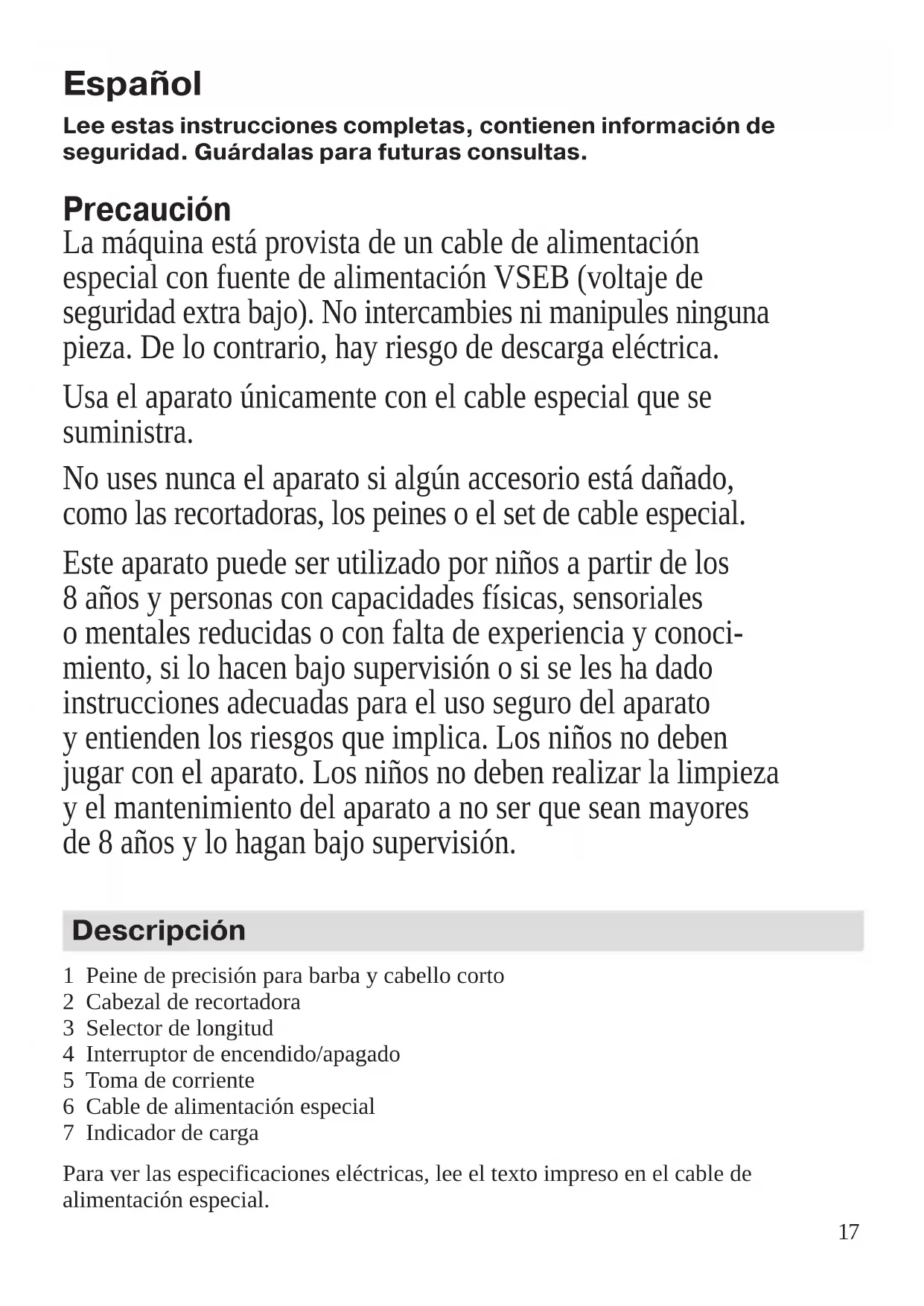 - El indicador de carga (7) del cable de alimentación especial se enciende continuamente cuando el aparato se está cargando.