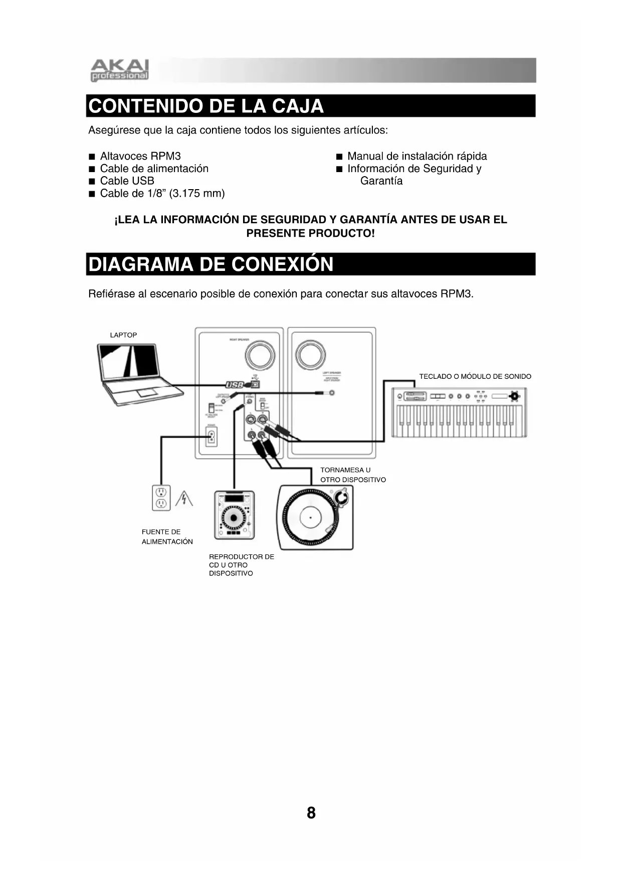 Asegúrese que la caja contiene todos los siguientes artículos: Altavoces RPM3 Cable de alimentación Cable USB Cable de 1/8” (3.175 mm) Manual de instalación rápida Información de Seguridad y Garantía ¡LEA LA INFORMACIÓN DE SEGURIDAD Y GARANTÍA ANTES DE USAR EL PRESENTE PRODUCTO!