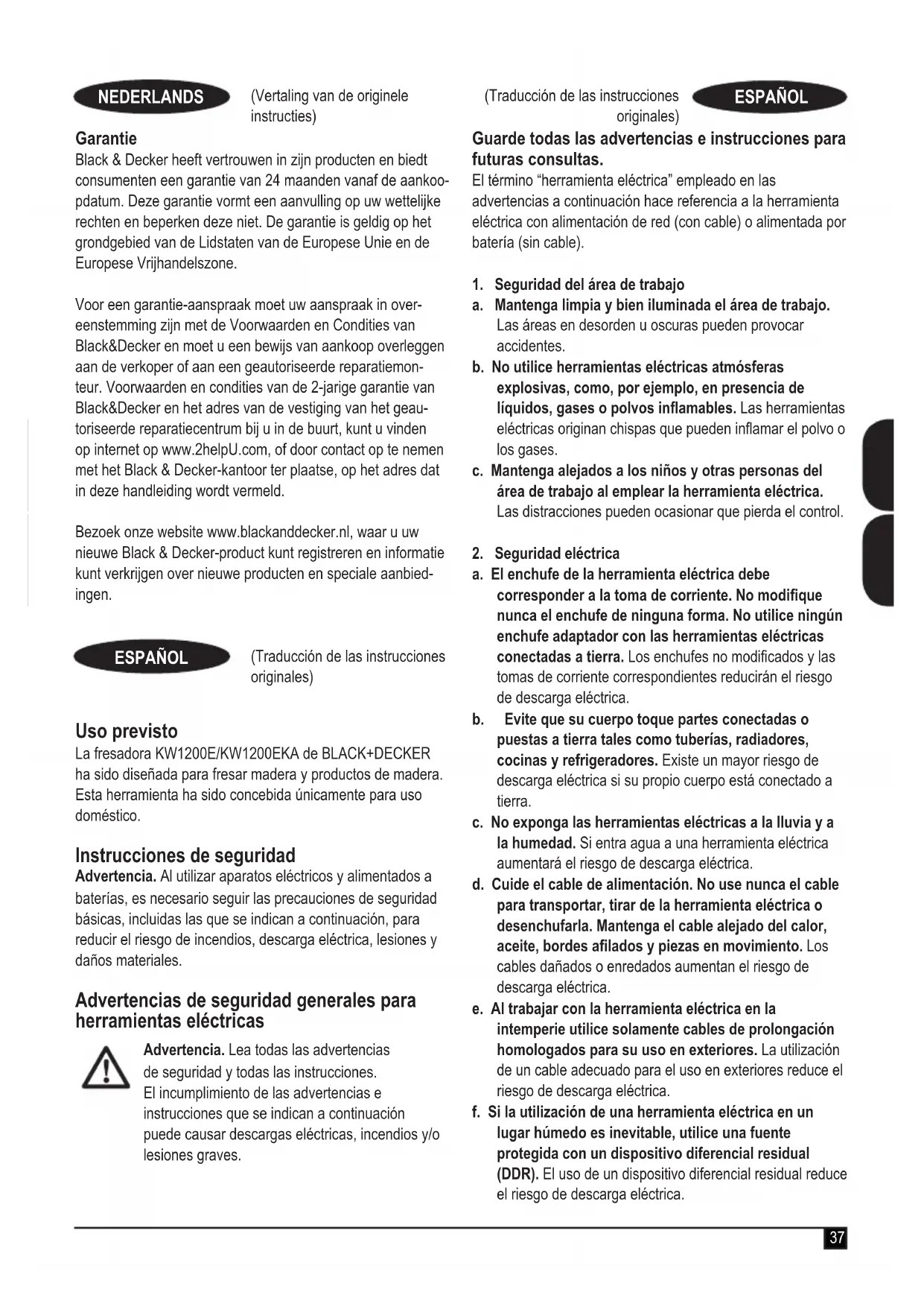 Fresadoras KW1200E, KW1200EKA Black & Decker declara que los productos descritos en la “cha técnica” cumplen las siguientes normas: 2006/42/CE, EN 60745-1:2009 + A11:2010, EN 60745-2-17:201043 (Traducción de las instrucciones originales) ESPAÑOL (Tradução das instruções originais) PORTUGUÊS Estos productos también cumplen las Directivas 2014/30/UE y 2011/65/UE. Para más información, póngase en contacto con Black & Decker en la siguiente dirección o consulte la parte posterior del manual. El abajo rmante es responsable de la elaboración del expediente técnico y realiza esta declaración en nombre de Black & Decker. Ray Laverick Director de Ingeniería Black & Decker Europe, 210 Bath Road, Slough, Berkshire, SL1 3YD Reino Unido 28/02/2017 Garantía Black & Decker confía en la calidad de sus productos y ofrece a los consumidores una garantía de 24 meses a partir de la fecha de compra. Esta garantía es adicional a sus derechos legales y no los menoscaba en modo alguno. La garantía es válida dentro de los territorios de los Estados Miembros de la Unión Europea y del Área de Libre Comercio Europea. Para reclamar la garantía, la reclamación se debe presentar de conformidad con las condiciones de Black & Decker. Ten- drá que adjuntar un justicante de compra al vendedor o al agente técnico autorizado. Las condiciones de la garantía de 2 años de Black & Decker y la ubicación de su agente técnico autorizado más cercano se pueden obtener en Internet en www.2helpU.com o poniéndose en contacto con su ocina local de Black & Decker en la dirección que se indica en este manual. Visite nuestro sitio web www.blackanddecker.co.uk para registrar su nuevo producto Black & Decker y recibir noticias sobre nuevos productos y ofertas especiales. Utilização pretendida A fresa BLACK+DECKER KW1200E, KW1200EKA foi concebida para fresar madeira e produtos de madeira. Esta ferramenta destina-se apenas para utilização doméstica. Instruções de segurança Atenção! Ao utilizar aparelhos eléctricos e com bateria, deve sempre cumprir medidas de segurança básicas, incluindo as que se seguem, de modo a reduzir os riscos de incêndio, choque eléctrico, ferimentos pessoais e danos materiais. Avisos de segurança gerais para ferramentas eléctricas Atenção! Leia todos os avisos de segurança e todas as instruções. O não cumprimento dos avisos e instruções indicados abaixo pode resultar em choque eléctrico, incêndio e/ou lesões graves. Guarde todos os avisos e instruções para futura referência. A expressão “ferramenta eléctrica” utilizada a seguir refere-se a ferramentas eléctricas com ligação à corrente eléctrica (com cabo) ou com bateria (sem os).