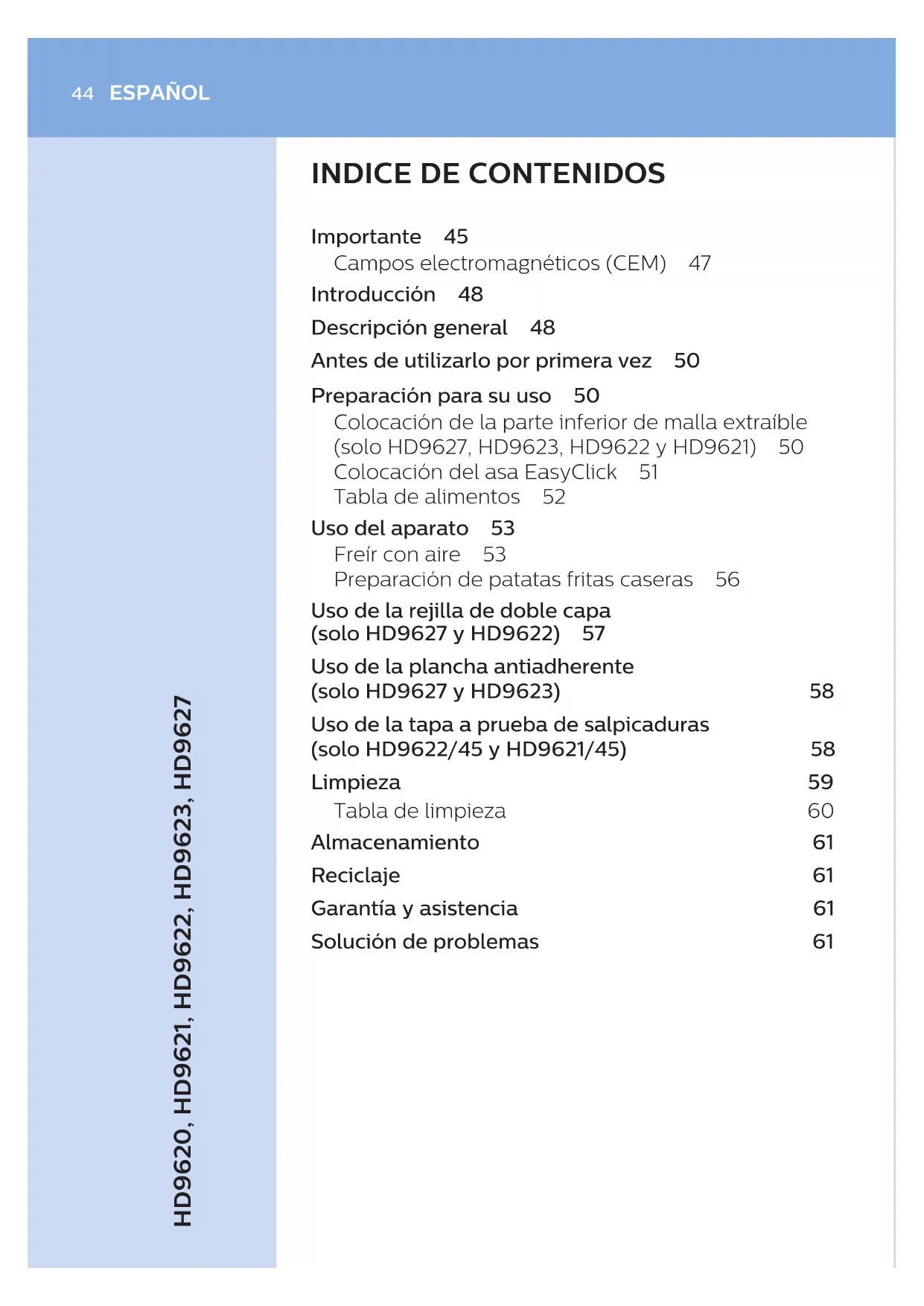 Importante 45 Campos electromagnéticos (CEM) 47 Introducción 48 Descripción general 48 Antes de utilizarlo por primera vez 50 Preparación para su uso 50 Colocación de la parte inferior de malla extraíble (solo HD9627, HD9623, HD9622 y HD9621) 50 Colocación del asa EasyClick 51 Tabla de alimentos 52 Uso del aparato 53 Freír con aire 53 Preparación de patatas fritas caseras 56 Uso de la rejilla de doble capa (solo HD9627 y HD9622) 57 Uso de la plancha antiadherente (solo HD9627 y HD9623) 58 Uso de la tapa a prueba de salpicaduras (solo HD9622/45 y HD9621/45) 58 Limpieza 59 Tabla de limpieza 60 Almacenamiento 61 Reciclaje 61 Garantía y asistencia 61 Solución de problemas 61