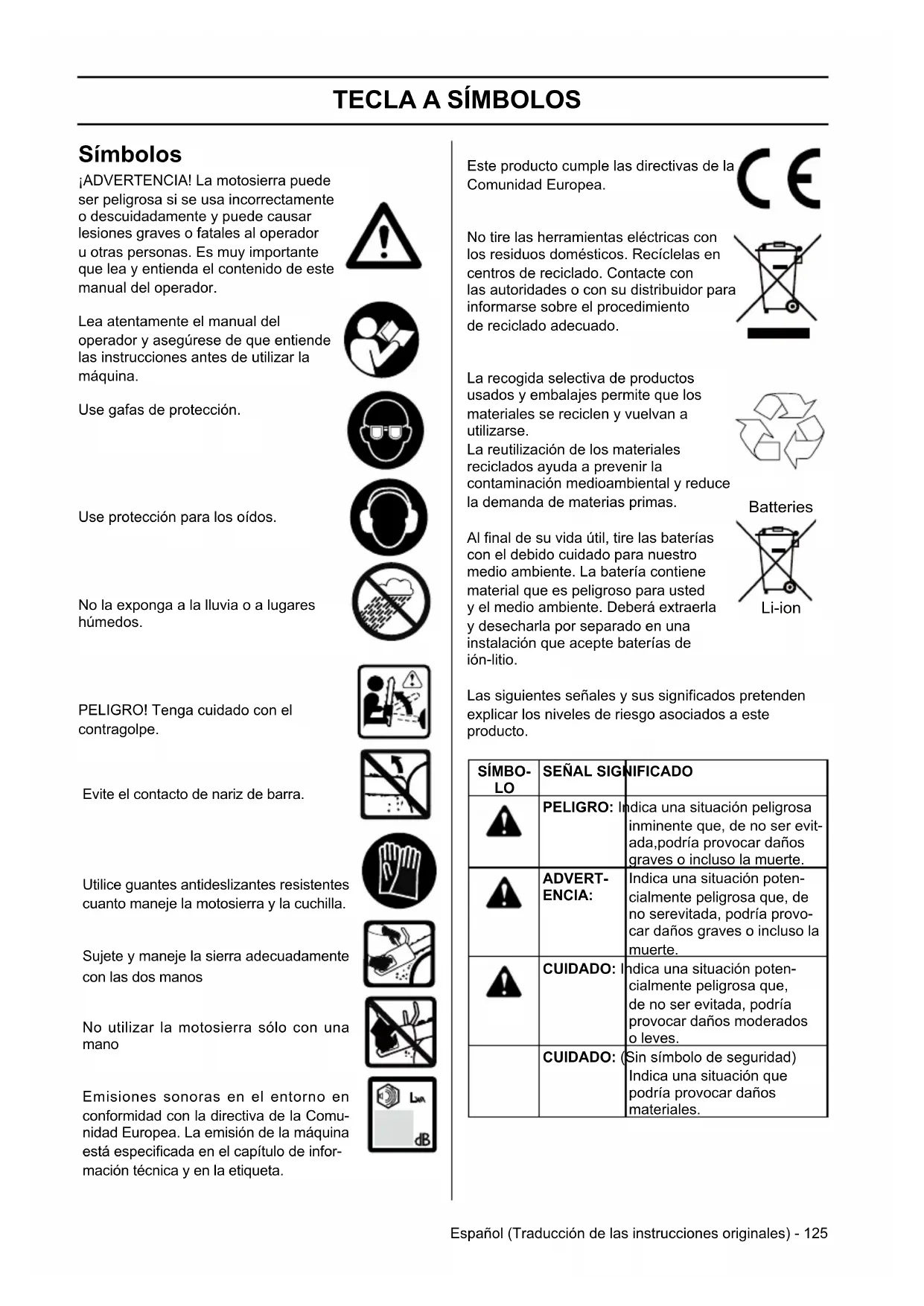 Símbolos ¡ADVERTENCIA! La motosierra puede ser peligrosa si se usa incorrectamente o descuidadamente y puede causar lesiones graves o fatales al operador u otras personas. Es muy importante que lea y entienda el contenido de este manual del operador. Lea atentamente el manual del operador y asegúrese de que entiende las instrucciones antes de utilizar la máquina. Use gafas de protección. Use protección para los oídos. No la exponga a la lluvia o a lugares húmedos. PELIGRO! Tenga cuidado con el contragolpe. Evite el contacto de nariz de barra. Utilice guantes antideslizantes resistentes cuanto maneje la motosierra y la cuchilla. Sujete y maneje la sierra adecuadamente con las dos manos No utilizar la motosierra sólo con una mano Emisiones sonoras en el entorno en conformidad con la directiva de la Comu- nidad Europea. La emisión de la máquina está especicada en el capítulo de infor- mación técnica y en la etiqueta. Este producto cumple las directivas de la Comunidad Europea. No tire las herramientas eléctricas con los residuos domésticos. Recíclelas en centros de reciclado. Contacte con las autoridades o con su distribuidor para informarse sobre el procedimiento de reciclado adecuado. La recogida selectiva de productos usados y embalajes permite que los materiales se reciclen y vuelvan a utilizarse. La reutilización de los materiales reciclados ayuda a prevenir la contaminación medioambiental y reduce la demanda de materias primas. Al final de su vida útil, tire las baterías con el debido cuidado para nuestro medio ambiente. La batería contiene material que es peligroso para usted y el medio ambiente. Deberá extraerla y desecharla por separado en una instalación que acepte baterías de ión-litio. Las siguientes señales y sus significados pretenden explicar los niveles de riesgo asociados a este producto. SÍMBO-