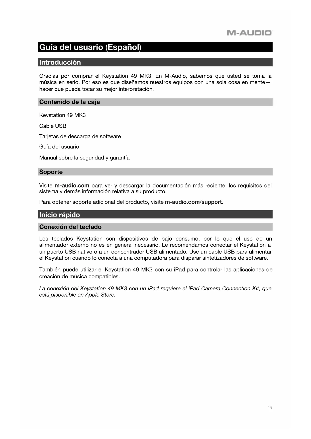The Keyboard is now back to the factory default settings.15 Guía del usuario (Español) Introducción Gracias por comprar el Keystation 49 MK3. En M-Audio, sabemos que usted se toma la música en serio. Por eso es que diseñamos nuestros equipos con una sola cosa en mente— hacer que pueda tocar su mejor interpretación. Contenido de la caja Keystation 49 MK3 Cable USB Tarjetas de descarga de software Guía del usuario Manual sobre la seguridad y garantía Soporte Visite m-audio.com para ver y descargar la documentación más reciente, los requisitos del sistema y demás información relativa a su producto. Para obtener soporte adicional del producto, visite m-audio.com/support. Inicio rápido Conexión del teclado Los teclados Keystation son dispositivos de bajo consumo, por lo que el uso de un alimentador externo no es en general necesario. Le recomendamos conectar el Keystation a un puerto USB nativo o a un concentrador USB alimentado. Use un cable USB para alimentar el Keystation cuando lo conecta a una computadora para disparar sintetizadores de software. También puede utilizar el Keystation 49 MK3 con su iPad para controlar las aplicaciones de creación de música compatibles. La conexión del Keystation 49 MK3 con un iPad requiere el iPad Camera Connection Kit, que está disponible en Apple Store.16 Instalación Los elementos que no se enumeran en Introducción > Contenido de la caja se venden por separado.