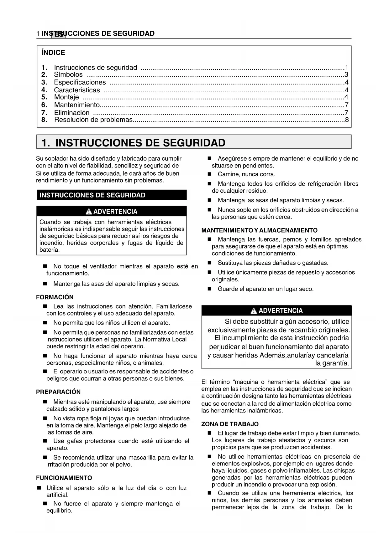 Mantenga las tuercas, pernos y tornillos apretados para asegurarse de que el aparato está en óptimas condiciones de funcionamiento. Sustituya las piezas dañadas o gastadas. Utilice únicamente piezas de repuesto y accesorios originales. Guarde el aparato en un lugar seco. ADVERTENCIA Si debe substituir algún accesorio, utilice exclusivamente piezas de recambio originales. El incumplimiento de esta instrucción podría perjudicar el buen funcionamiento del aparato y causar heridas Además,anularíay cancelaría la garantía. El término “máquina o herramienta eléctrica” que se emplea en las instrucciones de seguridad que se indican a continuación designa tanto las herramientas eléctricas que se conectan a la red de alimentación eléctrica como las herramientas inalámbricas.