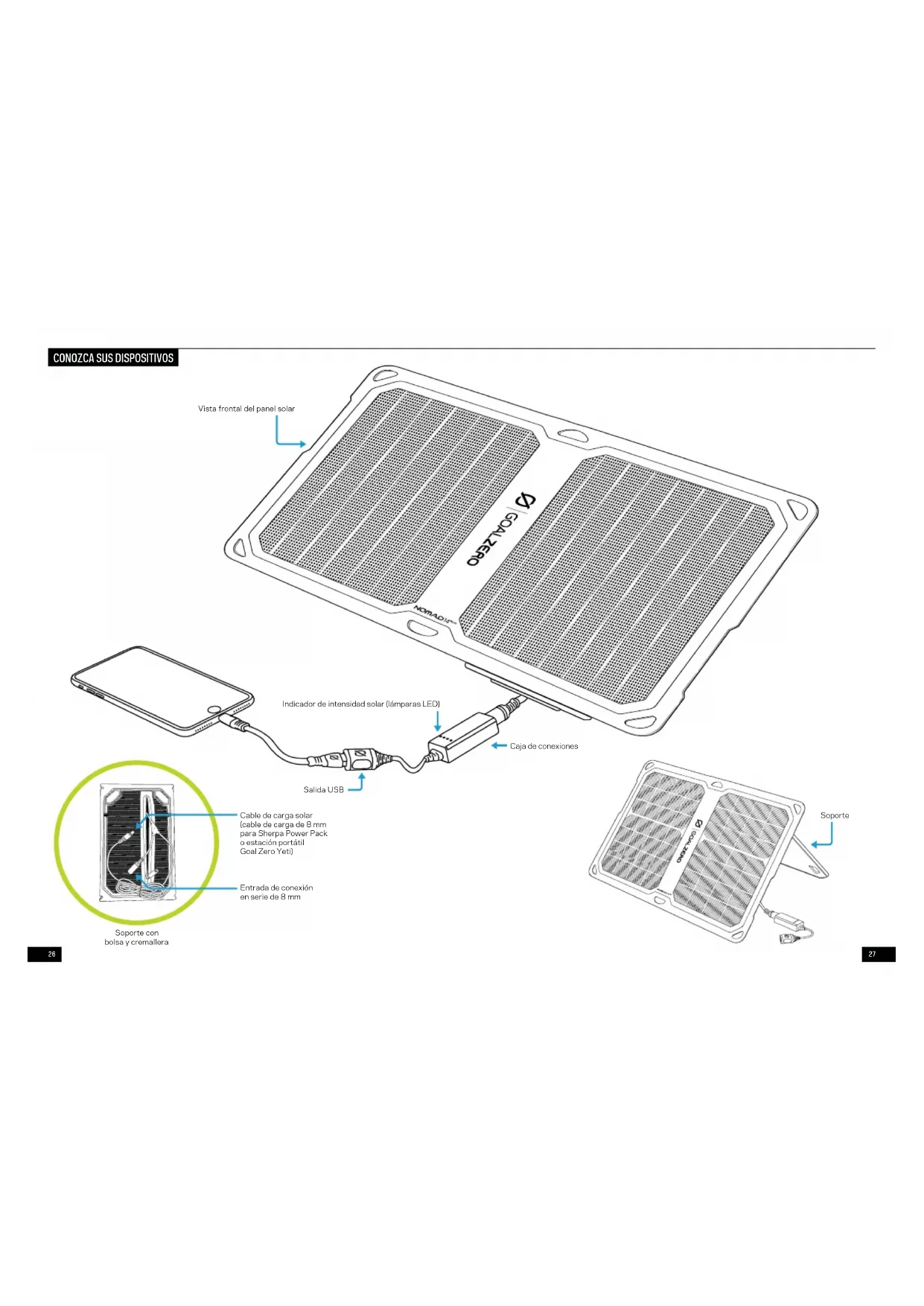 Caja de conexiones Indicador de intensidad solar (lámparas LED) Soporte Soporte con bolsa y cremallera Salida USB Cable de carga solar (cable de carga de 8 mm para Sherpa Power Pack o estación portátil Goal Zero Yeti) Entrada de conexión en serie de 8 mm2928 SOPORTE