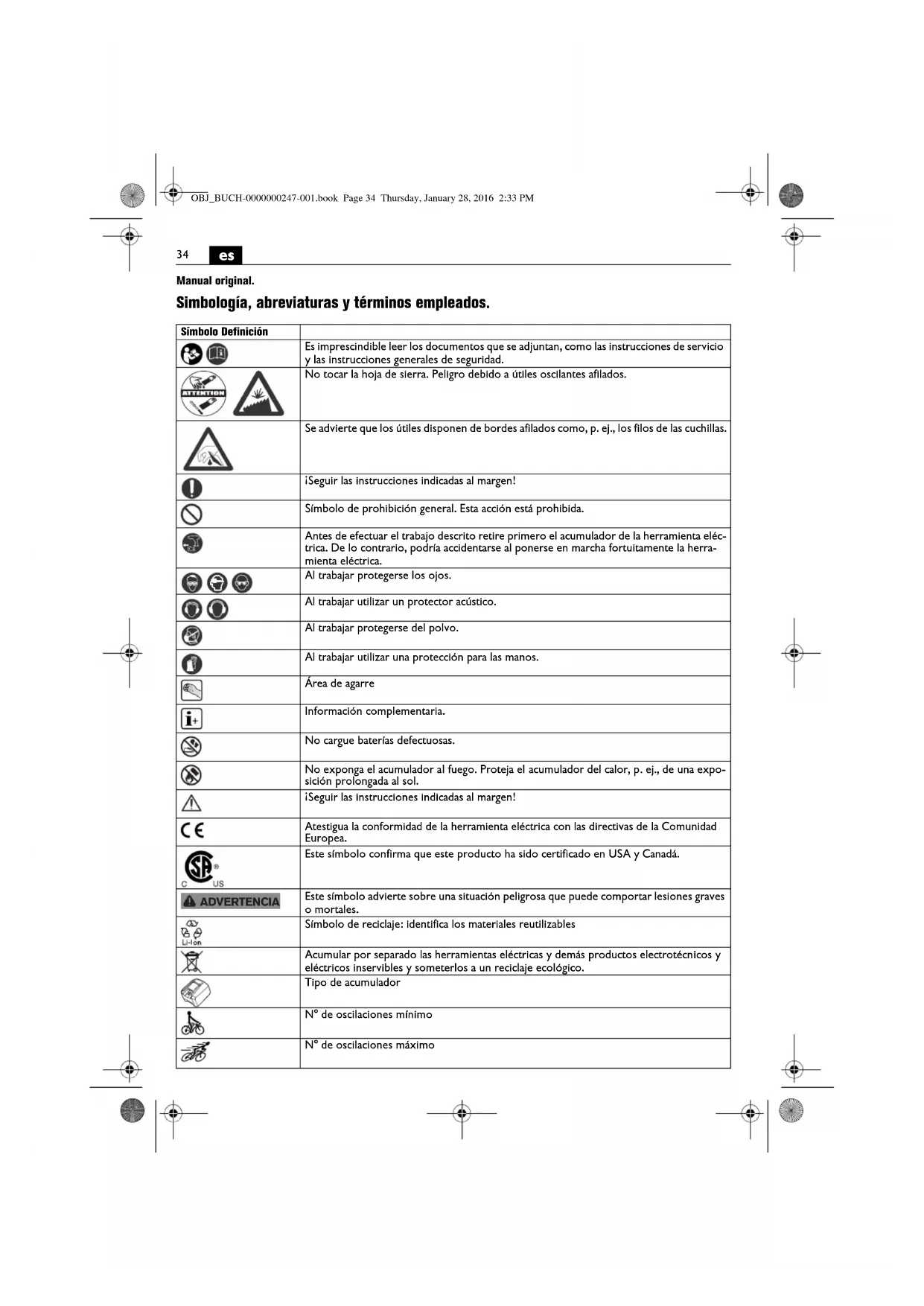 Manual original. Simbología, abreviaturas y términos empleados. Símbolo Definición Es imprescindible leer los documentos que se adjuntan, como las instrucciones de servicio y las instrucciones generales de seguridad. No tocar la hoja de sierra. Peligro debido a útiles oscilantes afilados. Se advierte que los útiles disponen de bordes afilados como, p. ej., los filos de las cuchillas. ¡Seguir las instrucciones indicadas al margen! Símbolo de prohibición general. Esta acción está prohibida. Antes de efectuar el trabajo descrito retire primero el acumulador de la herramienta eléc- trica. De lo contrario, podría accidentarse al ponerse en marcha fortuitamente la herra- mienta eléctrica. Al trabajar protegerse los ojos. Al trabajar utilizar un protector acústico. Al trabajar protegerse del polvo. Al trabajar utilizar una protección para las manos. Área de agarre Información complementaria. No cargue baterías defectuosas. No exponga el acumulador al fuego. Proteja el acumulador del calor, p. ej., de una expo- sición prolongada al sol. ¡Seguir las instrucciones indicadas al margen! Atestigua la conformidad de la herramienta eléctrica con las directivas de la Comunidad Europea. Este símbolo confirma que este producto ha sido certificado en USA y Canadá. Este símbolo advierte sobre una situación peligrosa que puede comportar lesiones graves o mortales. Símbolo de reciclaje: identifica los materiales reutilizables Acumular por separado las herramientas eléctricas y demás productos electrotécnicos y eléctricos inservibles y someterlos a un reciclaje ecológico. Tipo de acumulador N° de oscilaciones mínimo N° de oscilaciones máximo ADVERTENCIA OBJ_BUCH-0000000247-001.book Page 34 Thursday, January 28, 2016 2:33 PM35