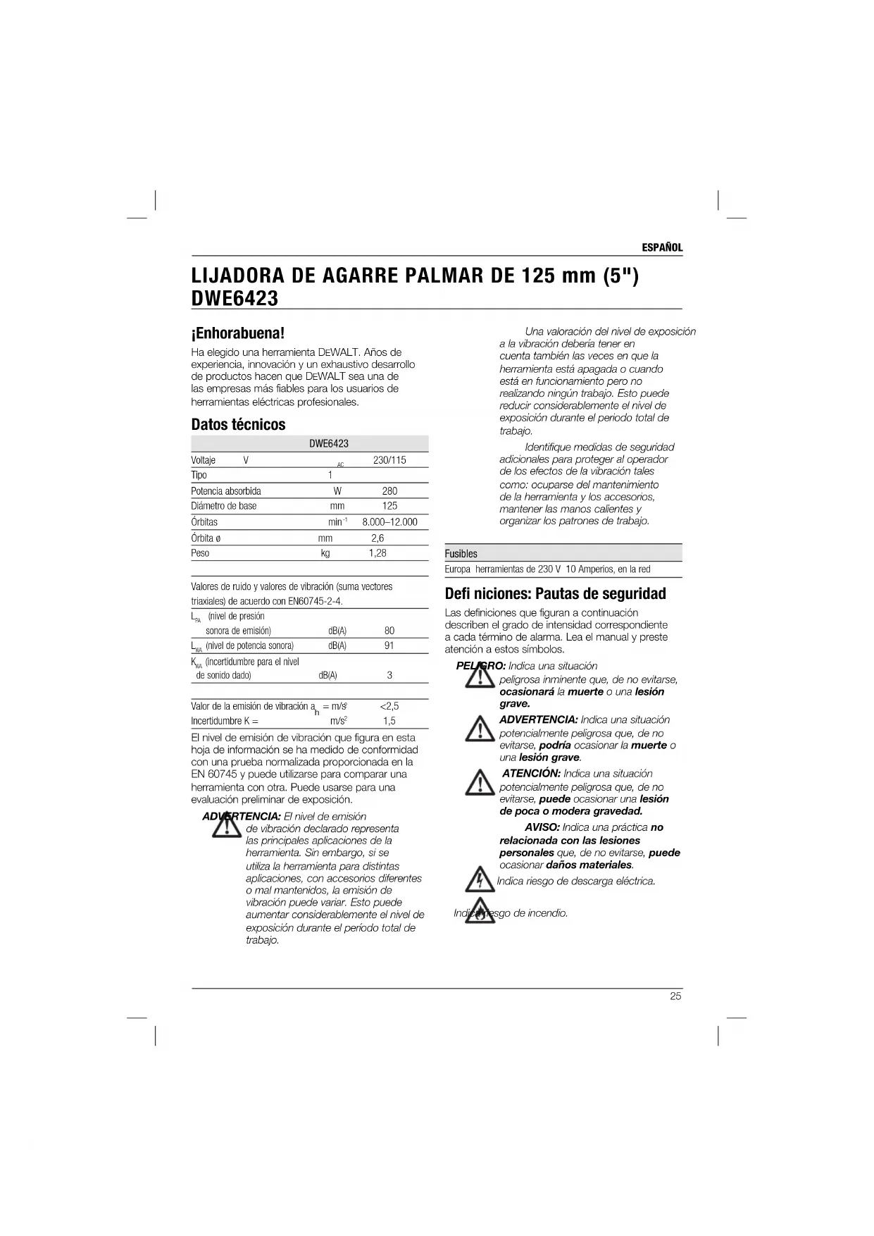 EWALT provides a facility for the collection and recycling of DEWALT products once they have reached the end of their working life. To take advantage of this service please return your product to any authorised repair agent who will collect them on our behalf. You can check the location of your nearest authorised repair agent by contacting your local DEWALT office at the address indicated in this manual. Alternatively, a list of authorised DEWALT repair agents and full details of our after-sales service and contacts are available on the Internet at: www.2helpU.com.25 ESPAÑOL Una valoración del nivel de exposición a la vibración debería tener en cuenta también las veces en que la herramienta está apagada o cuando está en funcionamiento pero no realizando ningún trabajo. Esto puede reducir considerablemente el nivel de exposición durante el periodo total de trabajo. Identifique medidas de seguridad adicionales para proteger al operador de los efectos de la vibración tales como: ocuparse del mantenimiento de la herramienta y los accesorios, mantener las manos calientes y organizar los patrones de trabajo. Fusibles Europa herramientas de 230 V 10 Amperios, en la red Defi niciones: Pautas de seguridad Las definiciones que figuran a continuación describen el grado de intensidad correspondiente a cada término de alarma. Lea el manual y preste atención a estos símbolos. PELIGRO: Indica una situación peligrosa inminente que, de no evitarse, ocasionará la muerte o una lesión grave. ADVERTENCIA: Indica una situación potencialmente peligrosa que, de no evitarse, podría ocasionar la muerte o una lesión grave. ATENCIÓN: Indica una situación potencialmente peligrosa que, de no evitarse, puede ocasionar una lesión de poca o modera gravedad. AVISO: Indica una práctica no relacionada con las lesiones personales que, de no evitarse, puede ocasionar daños materiales. Indica riesgo de descarga eléctrica. Indica riesgo de incendio. ¡Enhorabuena! Ha elegido una herramienta DEWALT. Años de experiencia, innovación y un exhaustivo desarrollo de productos hacen que DEWALT sea una de las empresas más fiables para los usuarios de herramientas eléctricas profesionales. Datos técnicos DWE6423 Voltaje V