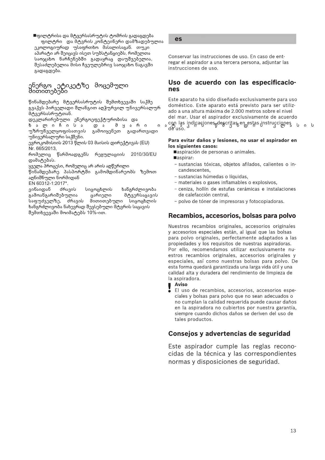 Conservar las instrucciones de uso. En caso de ent- regar el aspirador a una tercera persona, adjuntar las instrucciones de uso. Uso de acuerdo con las especificacio- nes Este aparato ha sido diseñado exclusivamente para uso doméstico. Este aparato está previsto para ser utiliz- ado a una altura máxima de 2.000 metros sobre el nivel del mar. Usar el aspirador exclusivamente de acuerdo con las indicaciones descritas en estas instrucciones de uso. Para evitar daños y lesiones, no usar el aspirador en los siguientes casos: aspiración de personas o animales. aspirar: − sustancias tóxicas, objetos afilados, calientes o in- candescentes, − sustancias húmedas o líquidas, − materiales o gases inflamables o explosivos, − ceniza, hollín de estufas cerámicas e instalaciones de calefacción central, − polvo de tóner de impresoras y fotocopiadoras. Recambios, accesorios, bolsas para polvo Nuestros recambios originales, accesorios originales y accesorios especiales están, al igual que las bolsas para polvo originales, perfectamente adaptados a las propiedades y los requisitos de nuestras aspiradoras. Por ello, recomendamos utilizar exclusivamente nu- estros recambios originales, accesorios originales y especiales, así como nuestras bolsas para polvo. De esta forma quedará garantizada una larga vida útil y una calidad alta y duradera del rendimiento de limpieza de la aspiradora.