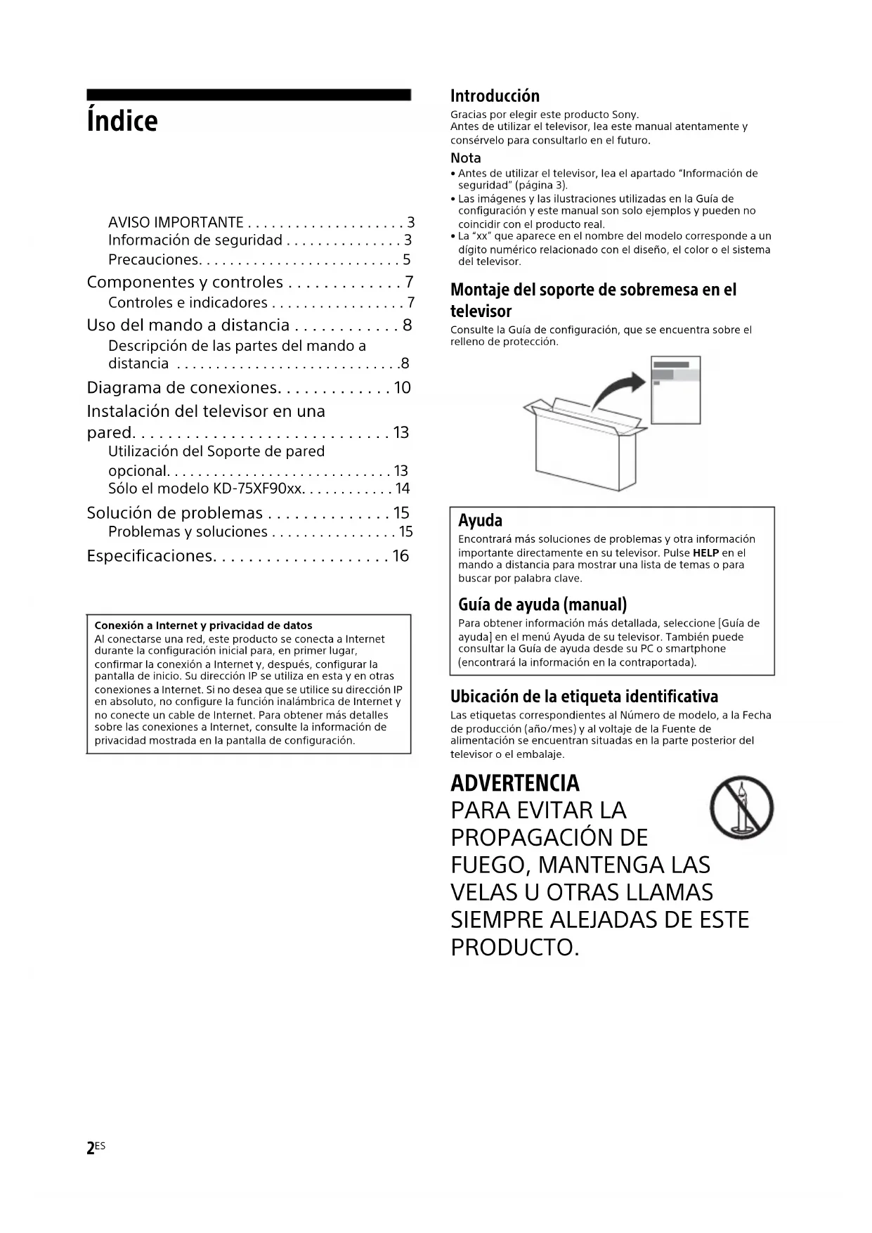 PRODUCTO. Conexión a Internet y privacidad de datosAl conectarse una red, este producto se conecta a Internet durante la configuración inicial para, en primer lugar, confirmar la conexión a Internet y, después, configurar la pantalla de inicio. Su dirección IP se utiliza en esta y en otras conexiones a Internet. Si no desea que se utilice su dirección IP en absoluto, no configure la función inalámbrica de Internet y no conecte un cable de Internet. Para obtener más detalles sobre las conexiones a Internet, consulte la información de privacidad mostrada en la pantalla de configuración. Ayuda Encontrará más soluciones de problemas y otra información importante directamente en su televisor. Pulse HELP en el mando a distancia para mostrar una lista de temas o para buscar por palabra clave. Guía de ayuda (manual) Para obtener información más detallada, seleccione [Guía de ayuda] en el menú Ayuda de su televisor. También puede consultar la Guía de ayuda desde su PC o smartphone (encontrará la información en la contraportada).C:\Users\CHAILING_2\Desktop\CU\EU-2\03ES\4733119112_03ES.fm master page: Right KD-75XF90xx / 65XF90xx / 55XF90xx / 49XF90xx 4-733-119-11(2)