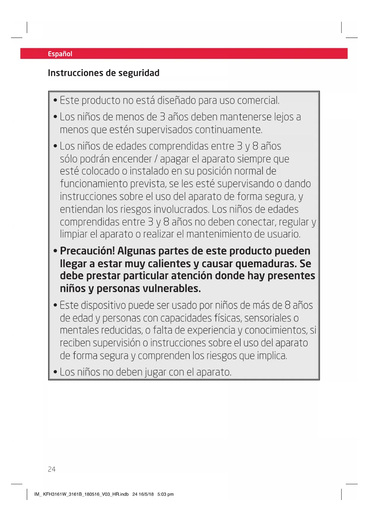 - Los niños no deben jugar con el aparato. Instrucciones de seguridad IM_ KFH3161W_3161B_180516_V03_HR.indb 24 16/5/18 5:03 pmEspañol
